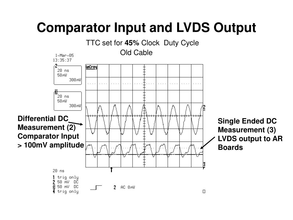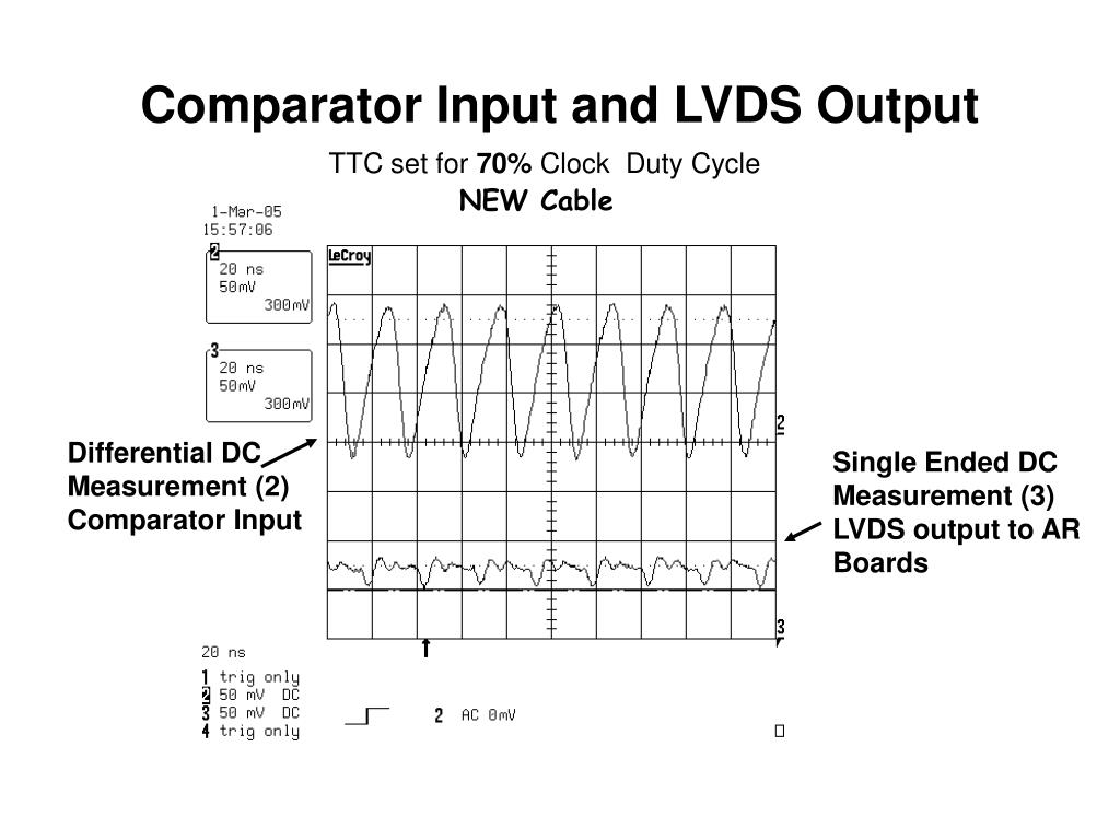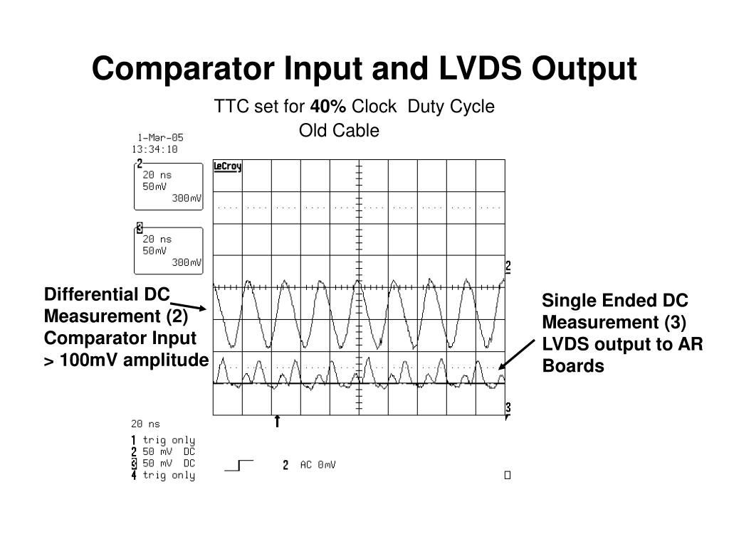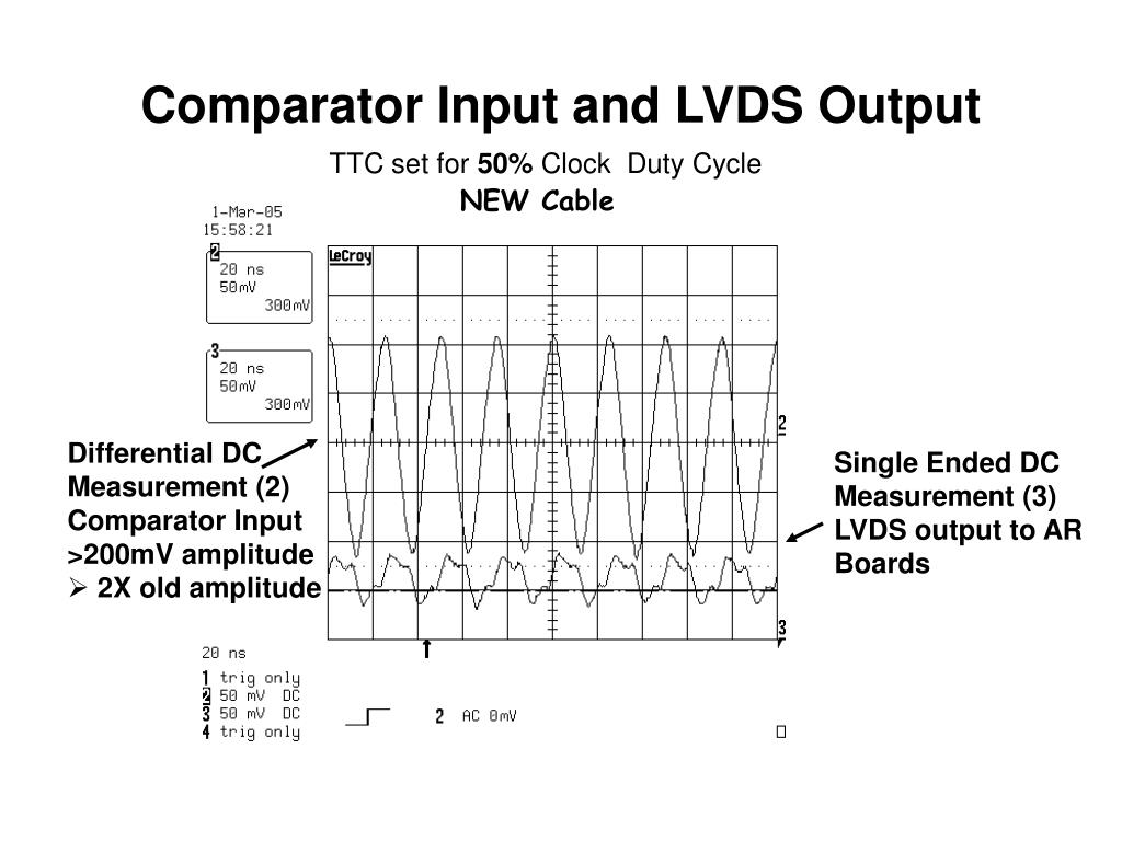 Comparator Input and LVDS Output TTC set for 45% Clock Duty Cycle Old Cable Differential DC Measurement (2) Comparator Input > 100mV amplitude Single Ended DC Measurement (3) LVDS output to AR Boards