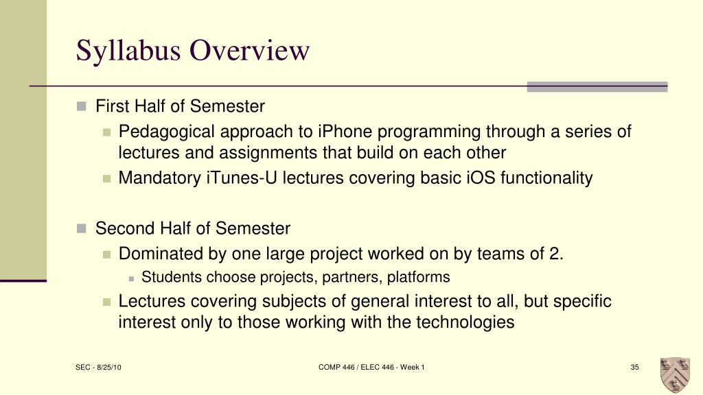 Syllabus Overview • First Half of Semester • Pedagogical approach to iPhone programming through a series of lectures and assignments that build on each other • Mandatory iTunes-U lectures covering basic iOS functionality • Second Half of Semester • Dominated by one large project worked on by teams of 2. • Students choose projects, partners, platforms • Lectures covering subjects of general interest to all, but specific interest only to those working with the technologies COMP 446 / ELEC 446 - Week 1