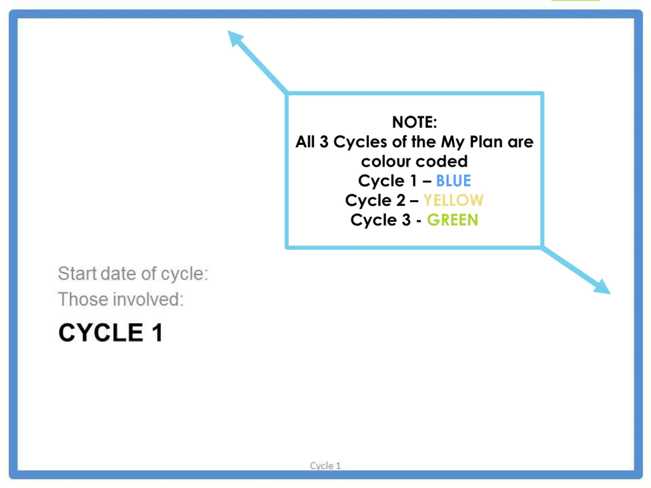 Example My Plan NOTE: All 3 Cycles of the My Plan are colour coded Cycle 1 – BLUE Cycle 2 – YELLOW Cycle 3 - GREEN