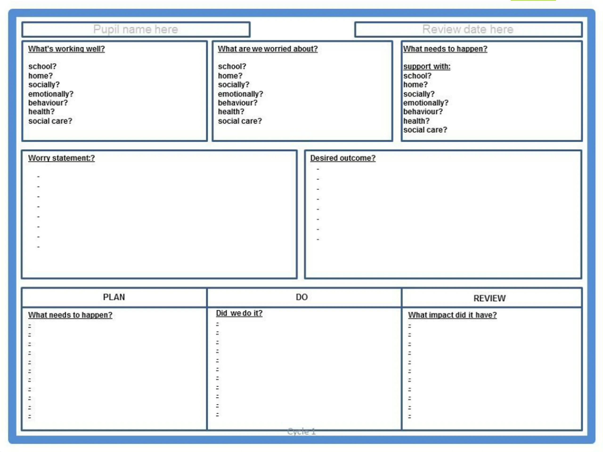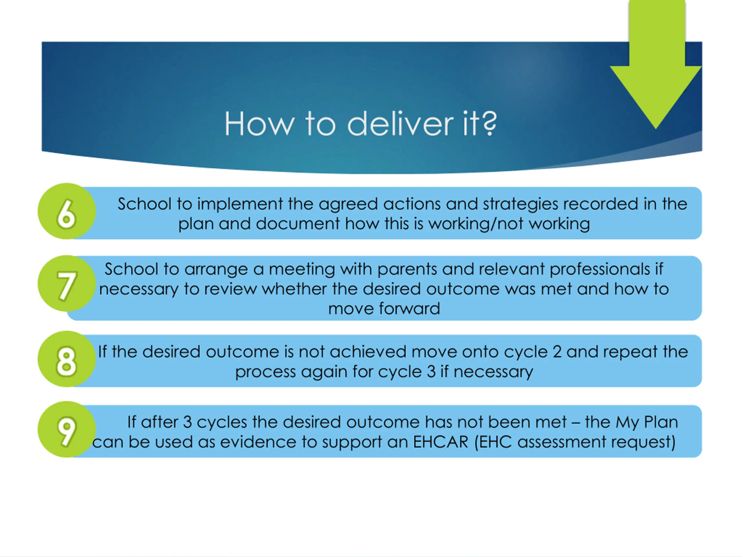 How to deliver it? S School to implement the agreed actions and strategies recorded in the plan and document how this is working/not working School to arrange a meeting with parents and relevant professionals if necessary to review whether the desired outcome was met and how to move forward If the desired outcome is not achieved move onto cycle 2 and repeat the process again for cycle 3 if necessary If after 3 cycles the desired outcome has not been met – the My Plan can be used as evidence to support an EHCAR (EHC assessment request)