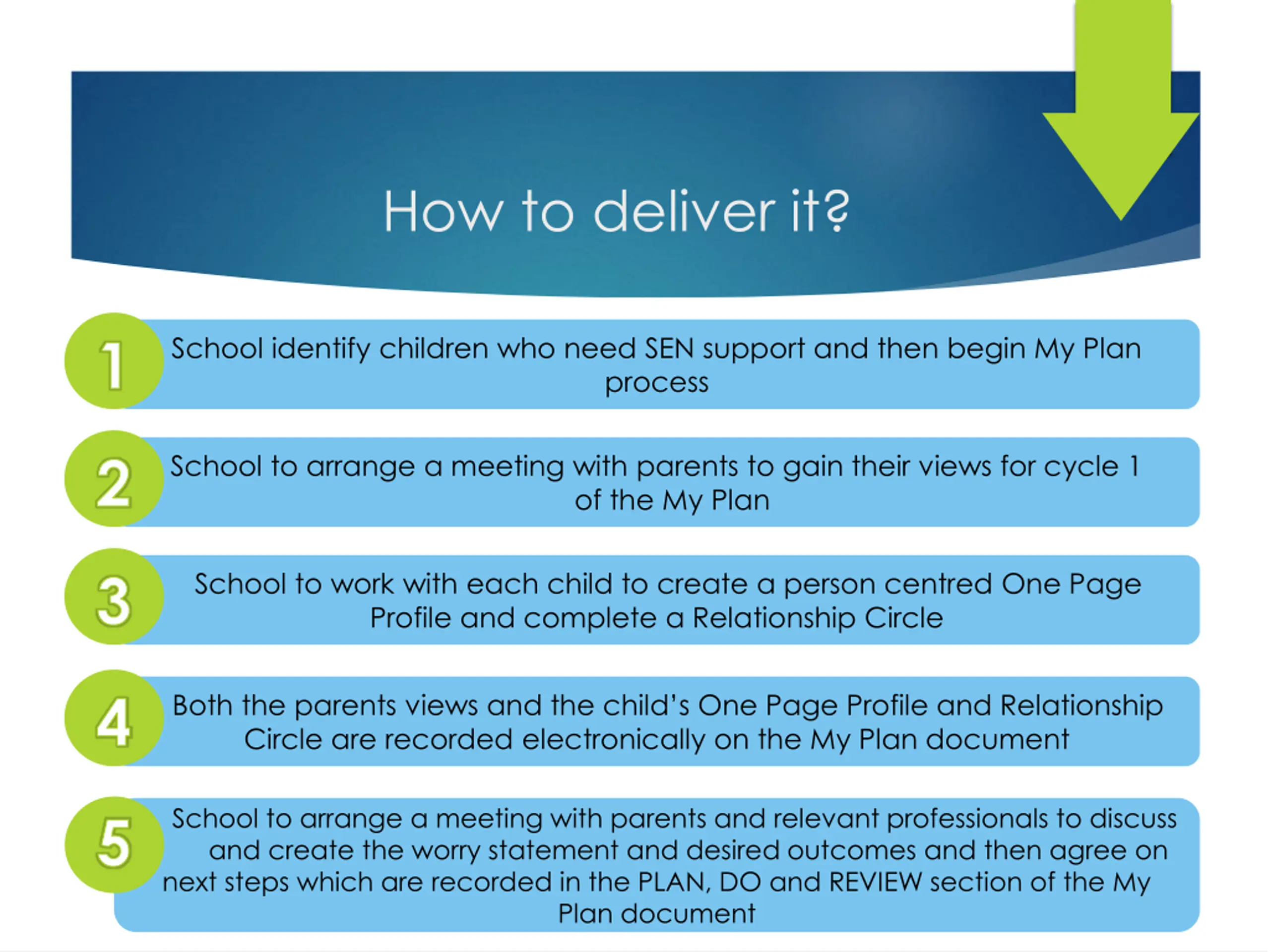 How to deliver it? School identify children who need SEN support and then begin My Plan process School to arrange a meeting with parents to gain their views for cycle 1 of the My Plan School to work with each child to create a person centred One Page Profile and complete a Relationship Circle Both the parents views and the child’s One Page Profile and Relationship Circle are recorded electronically on the My Plan document School to arrange a meeting with parents and relevant professionals to discuss and create the worry statement and desired outcomes and then agree on next steps which are recorded in the PLAN, DO and REVIEW section of the My Plan document