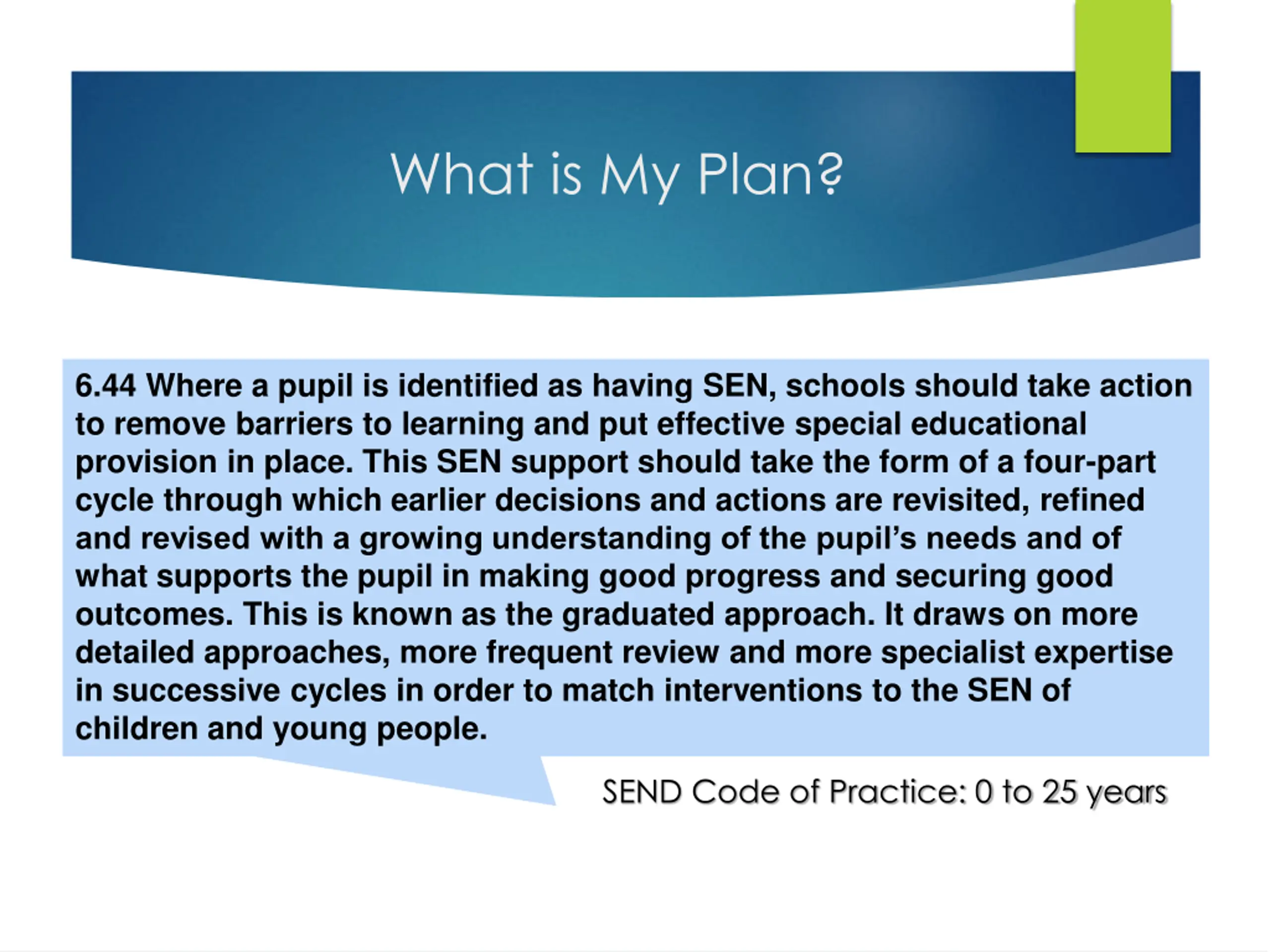 What is My Plan? 6.44 Where a pupil is identified as having SEN, schools should take action to remove barriers to learning and put effective special educational provision in place. This SEN support should take the form of a four-part cycle through which earlier decisions and actions are revisited, refined and revised with a growing understanding of the pupil’s needs and of what supports the pupil in making good progress and securing good outcomes. This is known as the graduated approach. It draws on more detailed approaches, more frequent review and more specialist expertise in successive cycles in order to match interventions to the SEN of children and young people. SEND Code of Practice: 0 to 25 years