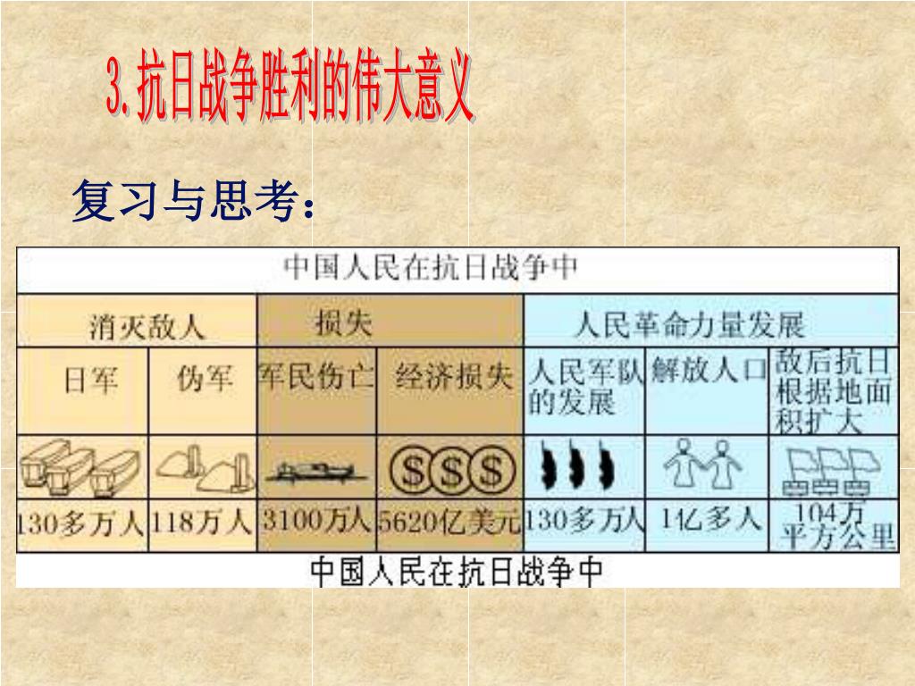 3.抗日战争胜利的伟大意义 复习与思考: 1.在中国近代史上,除抗日战争外,中国人民反侵略战争主要还有哪几次?这些战争的结果如何? 2.抗日战争的结果与上述战争的结果有什么不同?为什么?