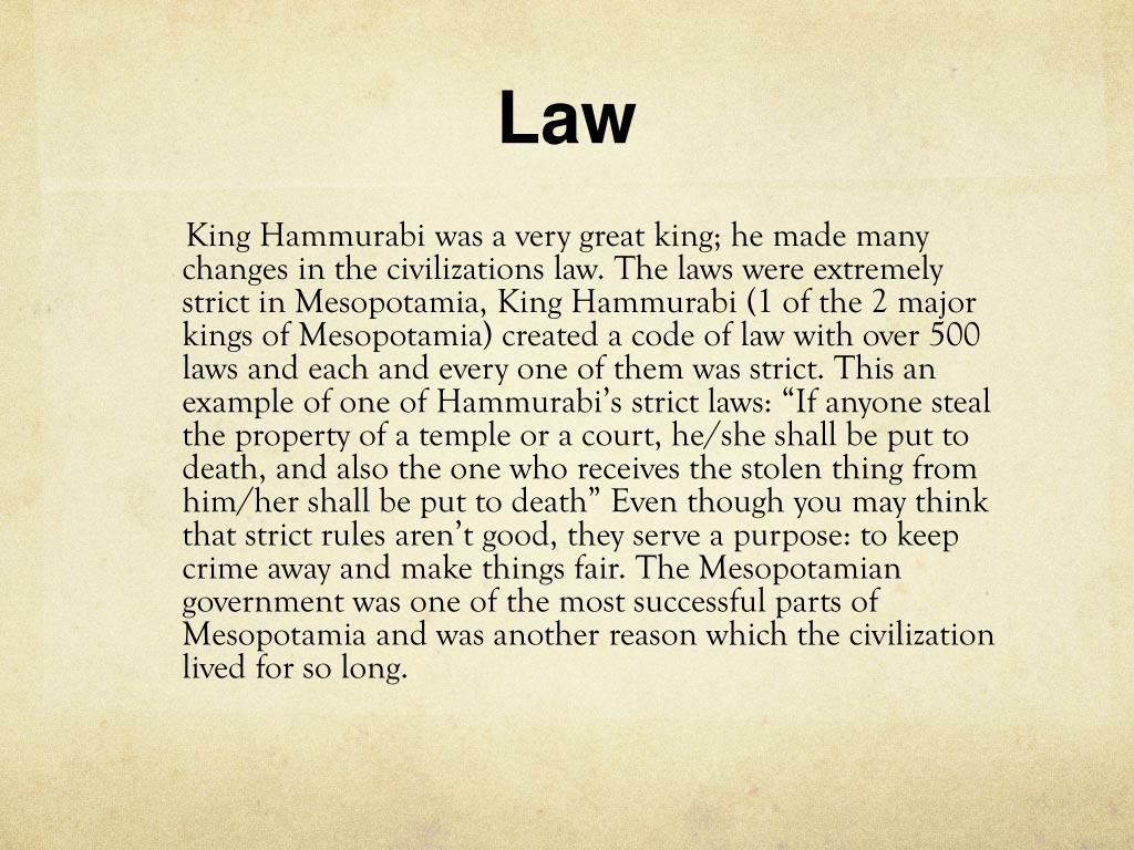Law King Hammurabi was a very great king; he made many changes in the civilizations law. The laws were extremely strict in Mesopotamia, King Hammurabi (1 of the 2 major kings of Mesopotamia) created a code of law with over 500 laws and each and every one of them was strict. This an example of one of Hammurabi’s strict laws: “If anyone steal the property of a temple or a court, he/she shall be put to death, and also the one who receives the stolen thing from him/her shall be put to death” Even though you may think that strict rules aren’t good, they serve a purpose: to keep crime away and make things fair. The Mesopotamian government was one of the most successful parts of Mesopotamia and was another reason which the civilization lived for so long.
