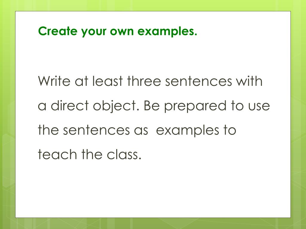 Write at least three sentences with a direct object. Be prepared to use the sentences as examples to teach the class. Create your own examples.