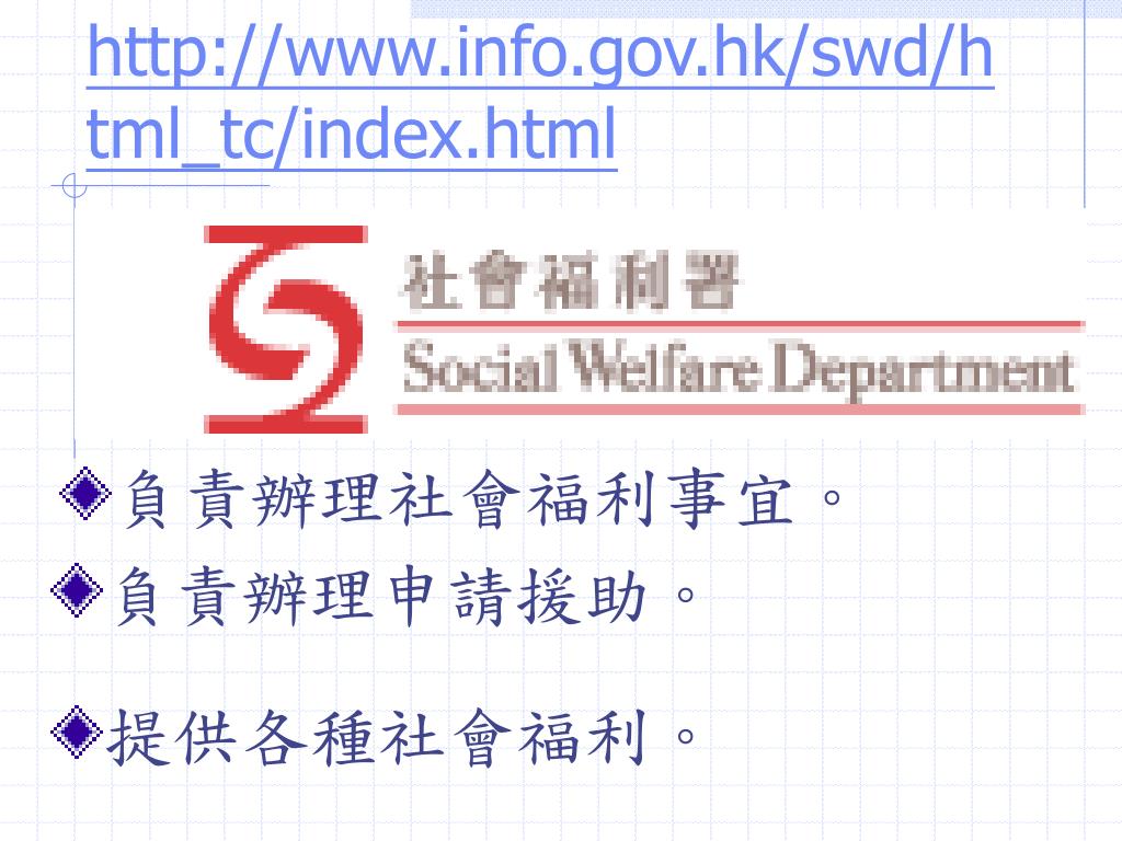 http://www.info.gov.hk/swd/html_tc/index.html • 負責辦理社會福利事宜。 • 負責辦理申請援助。 • 提供各種社會福利。