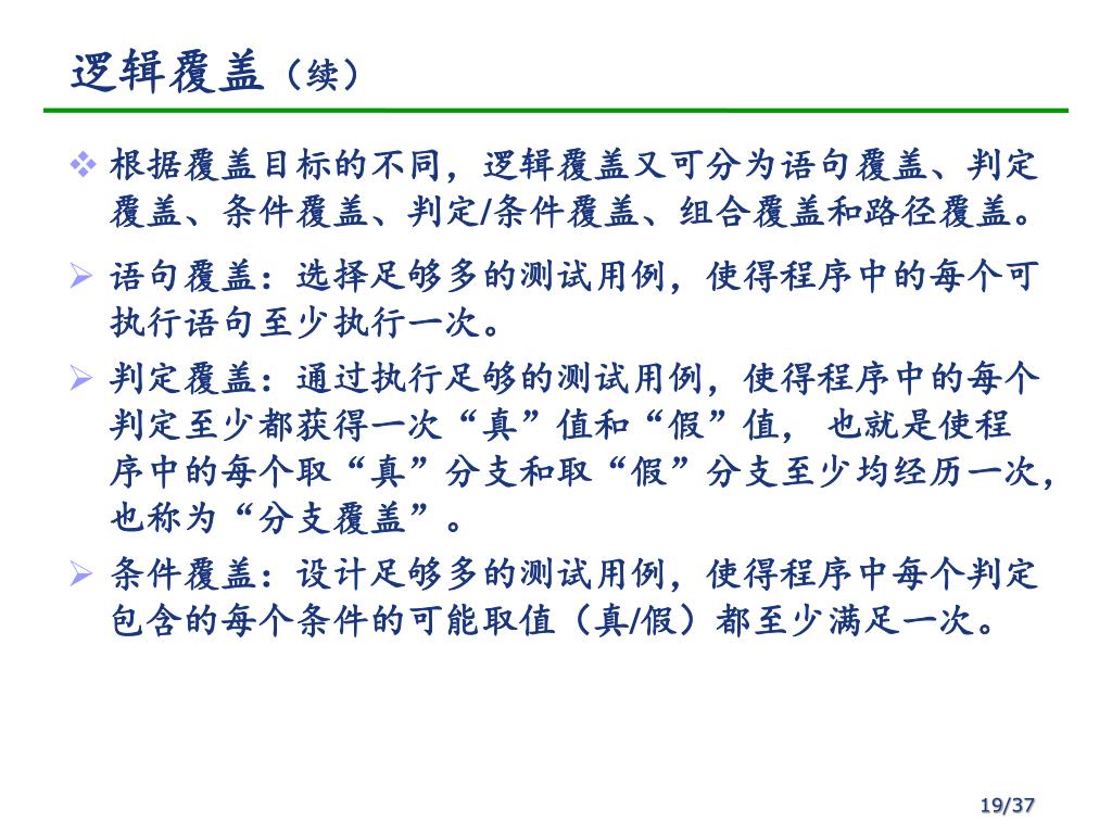 逻辑覆盖(续) • 根据覆盖目标的不同,逻辑覆盖又可分为语句覆盖、判定覆盖、条件覆盖、判定/条件覆盖、组合覆盖和路径覆盖。 • 语句覆盖:选择足够多的测试用例,使得程序中的每个可执行语句至少执行一次。 • 判定覆盖:通过执行足够的测试用例,使得程序中的每个判定至少都获得一次“真”值和“假”值, 也就是使程序中的每个取“真”分支和取“假”分支至少均经历一次,也称为“分支覆盖”。 • 条件覆盖:设计足够多的测试用例,使得程序中每个判定包含的每个条件的可能取值(真/假)都至少满足一次。