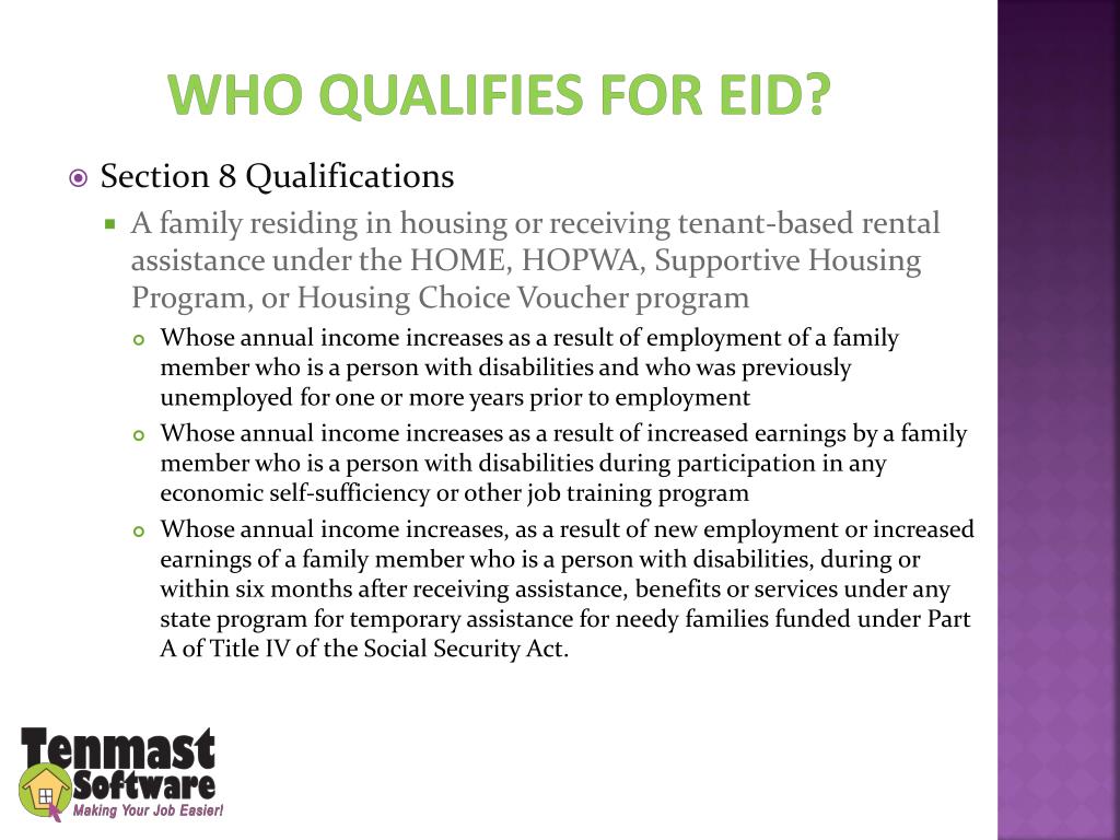 Who qualifies for EID? • Section 8 Qualifications • A family residing in housing or receiving tenant-based rental assistance under the HOME, HOPWA, Supportive Housing Program, or Housing Choice Voucher program • Whose annual income increases as a result of employment of a family member who is a person with disabilities and who was previously unemployed for one or more years prior to employment • Whose annual income increases as a result of increased earnings by a family member who is a person with disabilities during participation in any economic self-sufficiency or other job training program • Whose annual income increases, as a result of new employment or increased earnings of a family member who is a person with disabilities, during or within six months after receiving assistance, benefits or services under any state program for temporary assistance for needy families funded under Part A of Title IV of the Social Security Act.