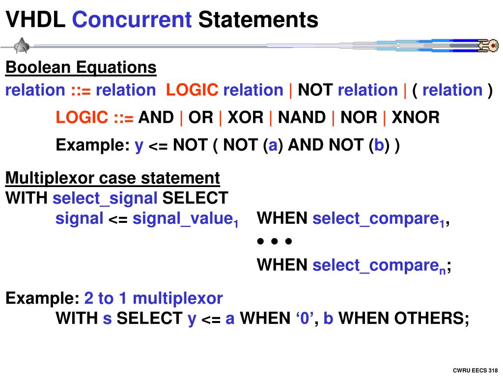 VHDL Concurrent Statements Boolean Equations relation::=relationLOGICrelation|NOT relation | ( relation ) LOGIC::= AND | OR | XOR | NAND | NOR | XNOR Multiplexor case statement WITH select_signal SELECTsignal <= signal_value1 WHEN select_compare1,• • •WHEN select_comparen; Example: y <= NOT ( NOT (a) AND NOT (b) ) Example: 2 to 1 multiplexorWITH s SELECT y <= a WHEN ‘0’, b WHEN OTHERS; CWRU EECS 318