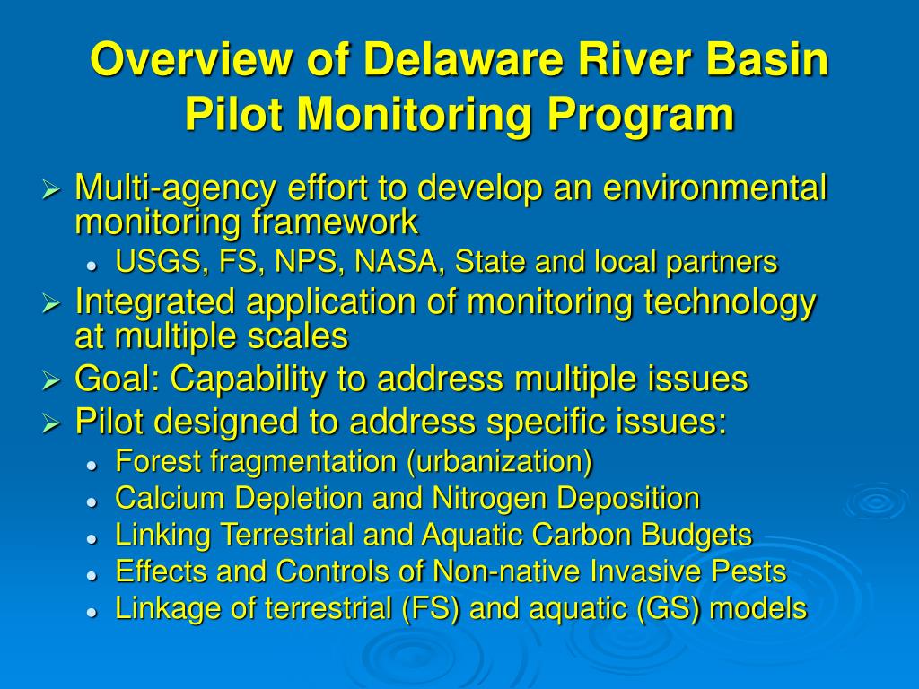 Overview of Delaware River Basin Pilot Monitoring Program • Multi-agency effort to develop an environmental monitoring framework • USGS, FS, NPS, NASA, State and local partners • Integrated application of monitoring technology at multiple scales • Goal: Capability to address multiple issues • Pilot designed to address specific issues: • Forest fragmentation (urbanization) • Calcium Depletion and Nitrogen Deposition • Linking Terrestrial and Aquatic Carbon Budgets • Effects and Controls of Non-native Invasive Pests • Linkage of terrestrial (FS) and aquatic (GS) models