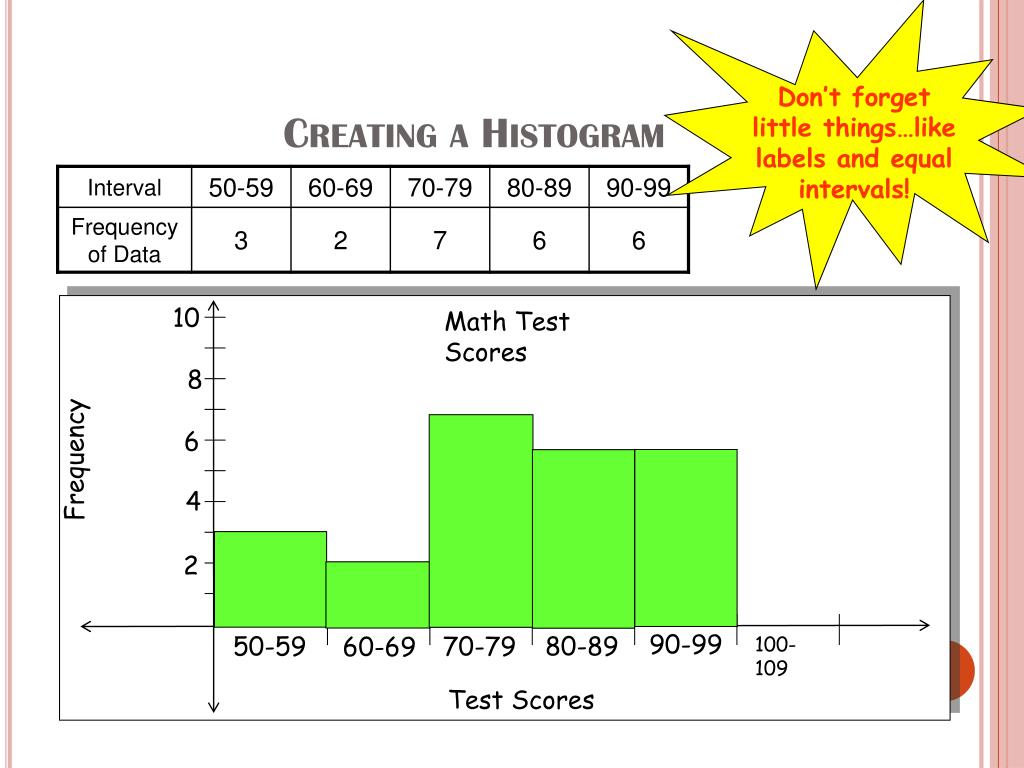 Creating a Histogram Don’t forget little things…like labels and equal intervals! 10 Math Test Scores 8 6 Frequency 4 2 90-99 80-89 50-59 70-79 60-69 100-109 Test Scores
