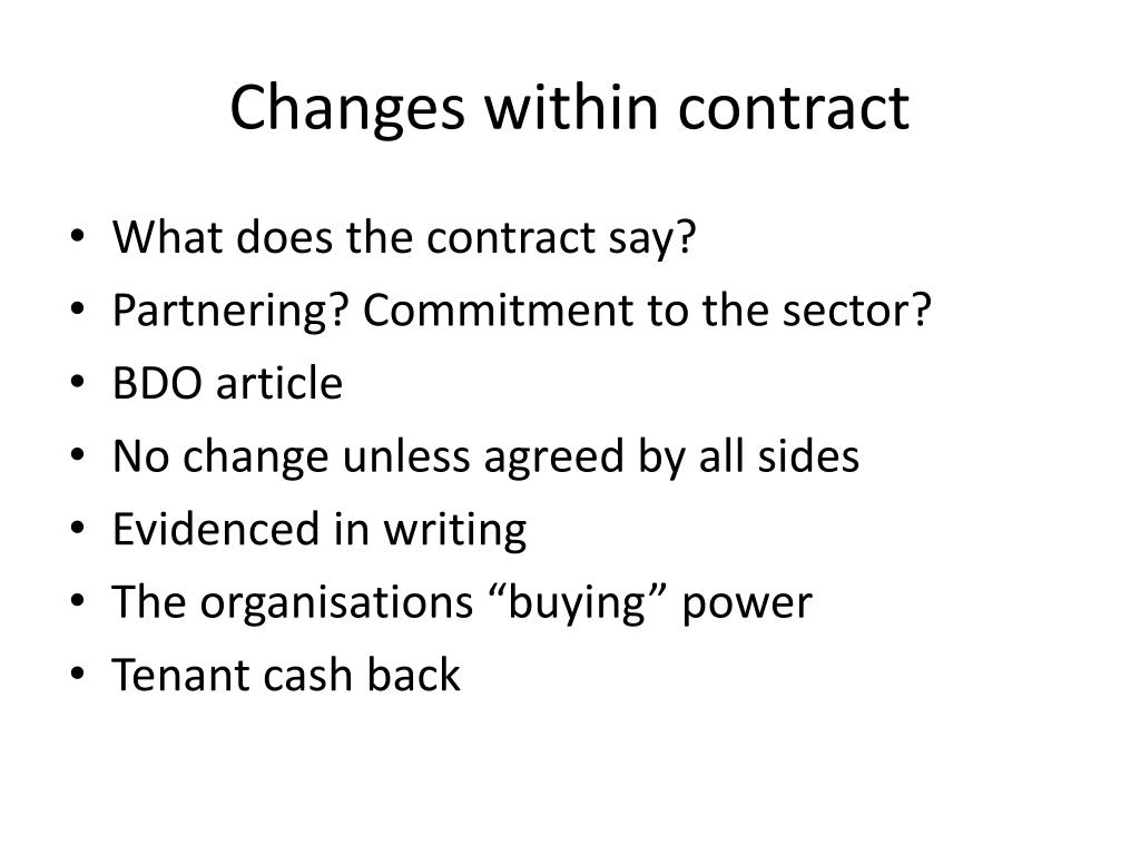 Changes within contract • What does the contract say? • Partnering? Commitment to the sector? • BDO article • No change unless agreed by all sides • Evidenced in writing • The organisations “buying” power • Tenant cash back