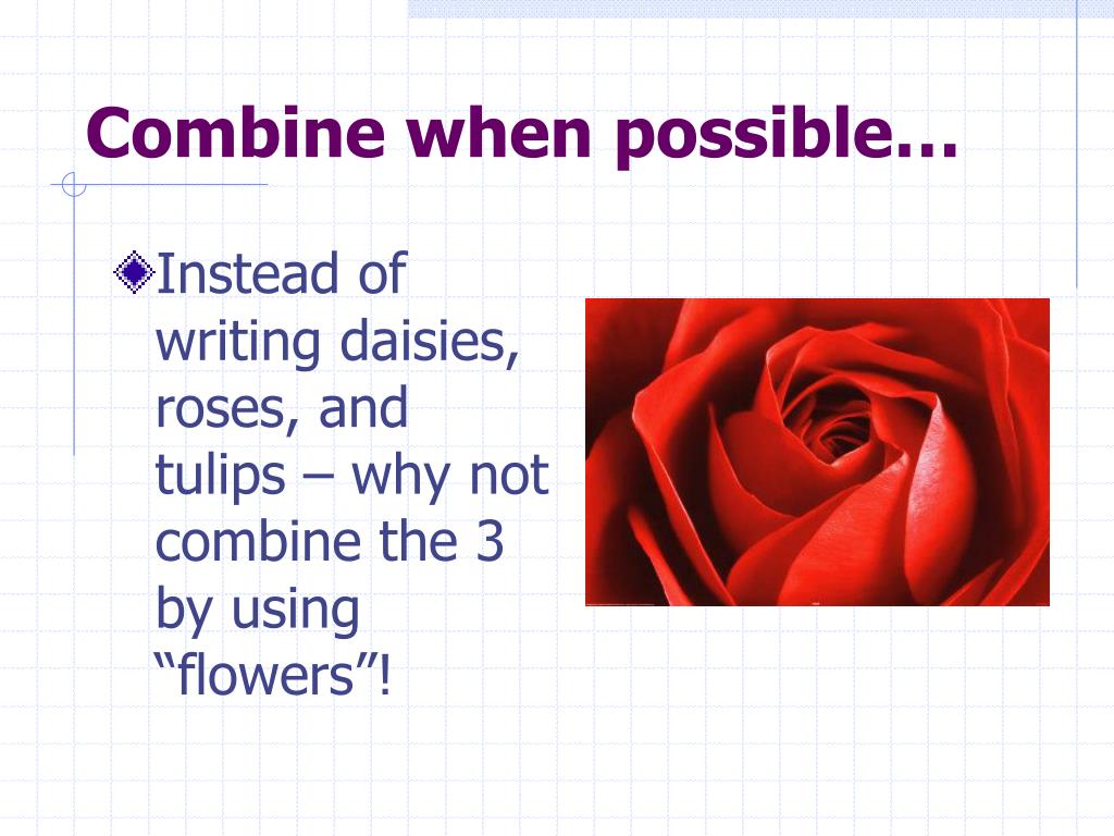 Combine when possible… • Instead of writing daisies, roses, and tulips – why not combine the 3 by using “flowers”!