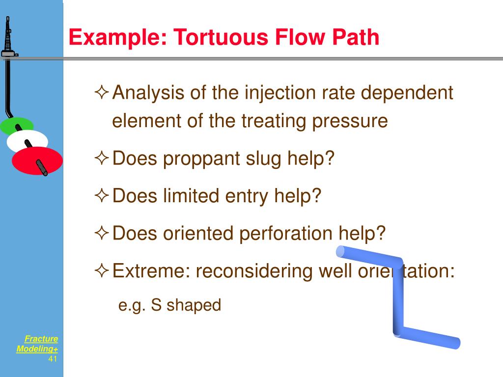 Example: Tortuous Flow Path • Analysis of the injection rate dependent element of the treating pressure • Does proppant slug help? • Does limited entry help? • Does oriented perforation help? • Extreme: reconsidering well orientation: e.g. S shaped
