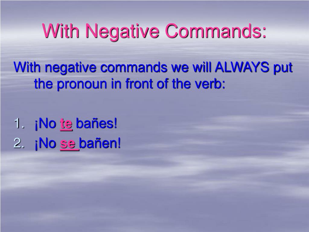 With Negative Commands: With negative commands we will ALWAYS put the pronoun in front of the verb: • ¡No te bañes! • ¡No se bañen!