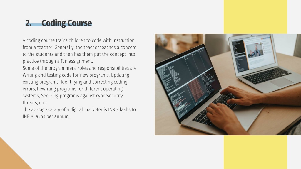 2. Coding Course A coding course trains children to code with instruction from a teacher. Generally, the teacher teaches a concept to the students and then has them put the concept into practice through a fun assignment. Some of the programmers' roles and responsibilities are Writing and testing code for new programs, Updating existing programs, Identifying and correcting coding errors, Rewriting programs for different operating systems, Securing programs against cybersecurity threats, etc. The average salary of a digital marketer is INR 3 lakhs to INR 8 lakhs per annum.
