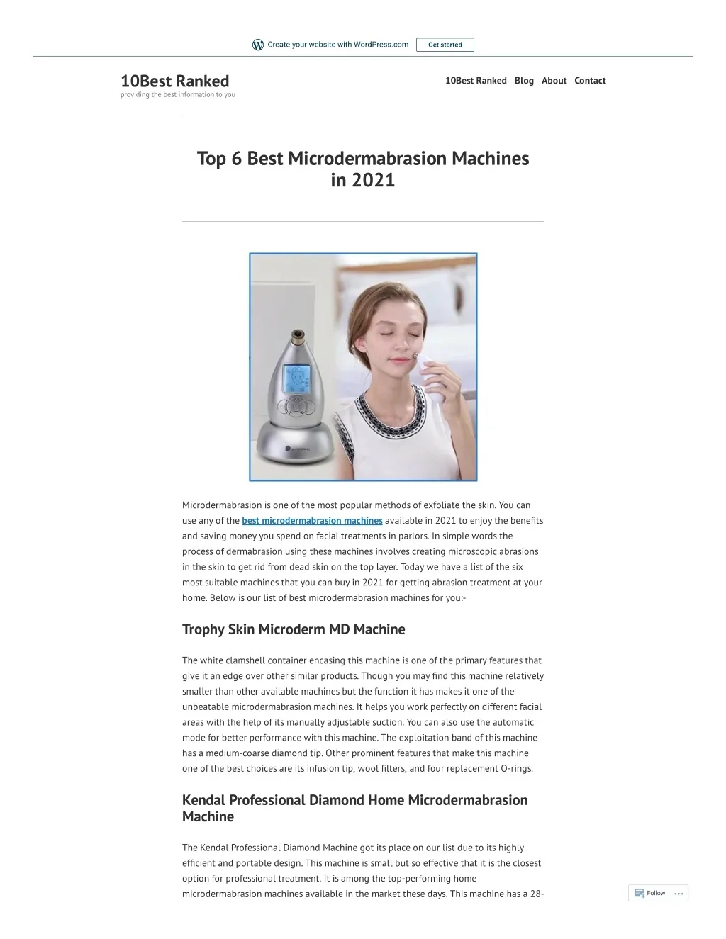 inch vacuum that can provide a suction up to 3mm friction depth. You will get 240 cotton ?lters, two oil ?lters, and an intensity knob with this product. Create your website with WordPress.com Get started Microderm GLO Diamond Home Machine It has one of the unique designs that offer you maximum device control even while using it at home. It is one of the best microdermabrasion machines available these days with pretty impressive features. This device uses light abrasion to gently remove the outer facial skin layer to provide you an ergonomic yet pleasant experience. The machine has collagen rebuilding abilities that help in increasing the blood ?ow in facial tissues. It has three levels of suctions for different needs with a patented diamond dispersion system. To control this machine is also very easy by using the display screen and beep function indicating the time to focus on other facial areas. RejuvadermMD Home Microdermabrasion Machine Nothing can beat this one of the best microdermabrasion machines you can ever get in 2021. Though this product can seem to be a little costly in comparison to the other options its abilities to provide unmatched exfoliation, extraction, and infusion make it worth buying. This machine has four levels of function but most of the users can get satisfactory results from even the lowest settings. The most bene?cial thing about this machine is that it can infuse creams into the skin for more satisfactory results. PMD Personal Home Microdermabrasion Machine PMD Personal Home Microdermabrasion Machine works with a combination of diamond tip dermabrasion and suction that helps to exfoliates the skin to suck away the dead cells from the skin. This device is one of the most portable machines with a light and compact design. This product comes with attachments of different kinds to provide you better utility. You will get seven exfoliating disc attachments with this machine with different grain gits to provide outstanding results. You can work on different body parts easily using its large head with intense suction. Silk’n Revit Home Microdermabrasion Machine We would like to ?nish our list of best home microdermabrasion machines in 2021 with Silk’n Revit. This machine is suitable for all skin types and is one of the most pocket- friendly options for people who want to buy the best microdermabrasion machines. Though the primary use of this machine is for facial treatments, it is equally effective on other body parts too. Share this: Twitter Facebook Loading... bestranked10 April 29, 2021 Uncategorized best microdermabrasion machine 2021 Published by bestranked10 The truth is, people look for reviews to validate their buying decision. At 10BestRanked, we do just that. As a consumer, you may wonder what is the best possible product for something you need or want. Every day, we strive to deliver the answers our readers seek. Sure, you can ask your family and friends for advice about the product you want Follow
