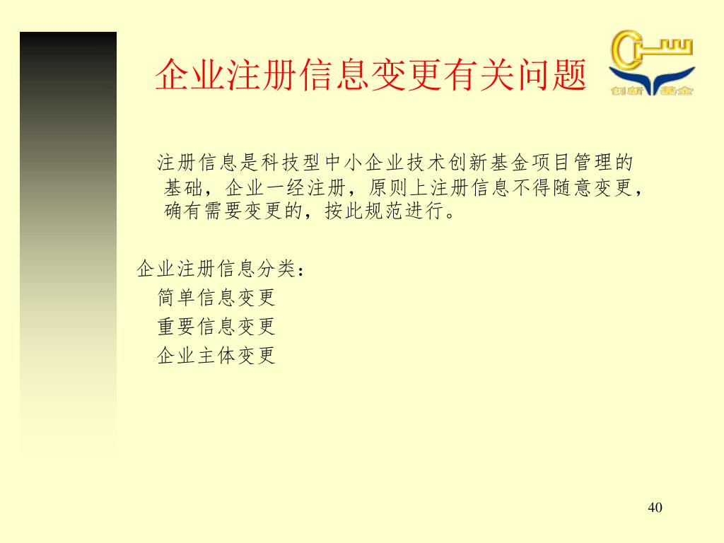 科技型中小企业技术创新基金 2010 年申报培训. 科技部科技型中小企业技术创新基金管理中心. 主要内容. 申报须知的主要内容 与往年的主要不同 需要注意的几个问题 企业注册信息变更有关问题. 项目类型. 科技型中小企业技术创新项目 中小企业公共技术服务机构补助资金项目 科技型中小企业创业投资引导基金项目. 项目类型及基本要求 ---- 支持对象. 科技型中小企业技术创新项目. (一)支持的项目需符合以下条件: 1 .符合国家产业、技术政策,技术含量高,创新性较强,知识产权清晰,技术处于国内领先水平; 2 .自主研发项目,具有自主知识产权;