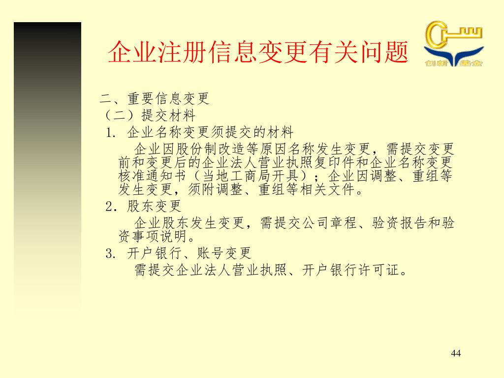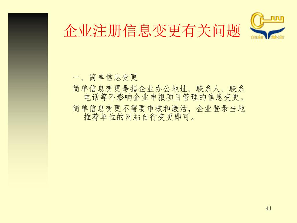 企业注册信息变更有关问题 一、简单信息变更 简单信息变更是指企业办公地址、联系人、联系电话等不影响企业申报项目管理的信息变更。 简单信息变更不需要审核和激活,企业登录当地推荐单位的网站自行变更即可。 二、重要信息变更 重要信息变更是指企业名称、股东、开户银行、账号等影响企业申报项目管理的信息变更。企业在项目申报受理期间,即发生企业名称、股东变更的,该项目当年将不予受理。