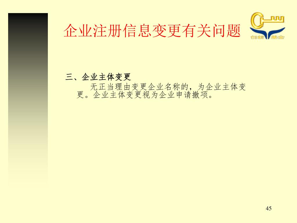 企业注册信息变更有关问题 三、企业主体变更 无正当理由变更企业名称的,为企业主体变更。企业主体变更视为企业申请撤项。
