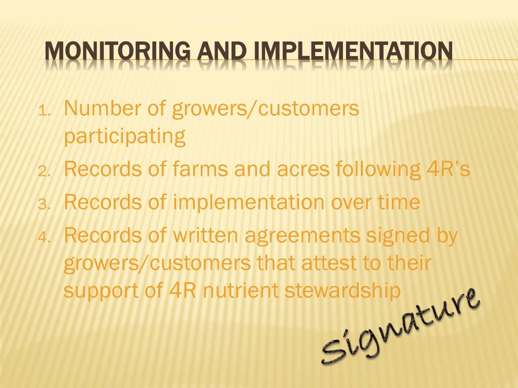 Number of growers/customers participating Records of farms and acres following 4R’s Records of implementation over time Records of written agreements signed by growers/customers that attest to their support of 4R nutrient stewardship Monitoring and Implementation Signature