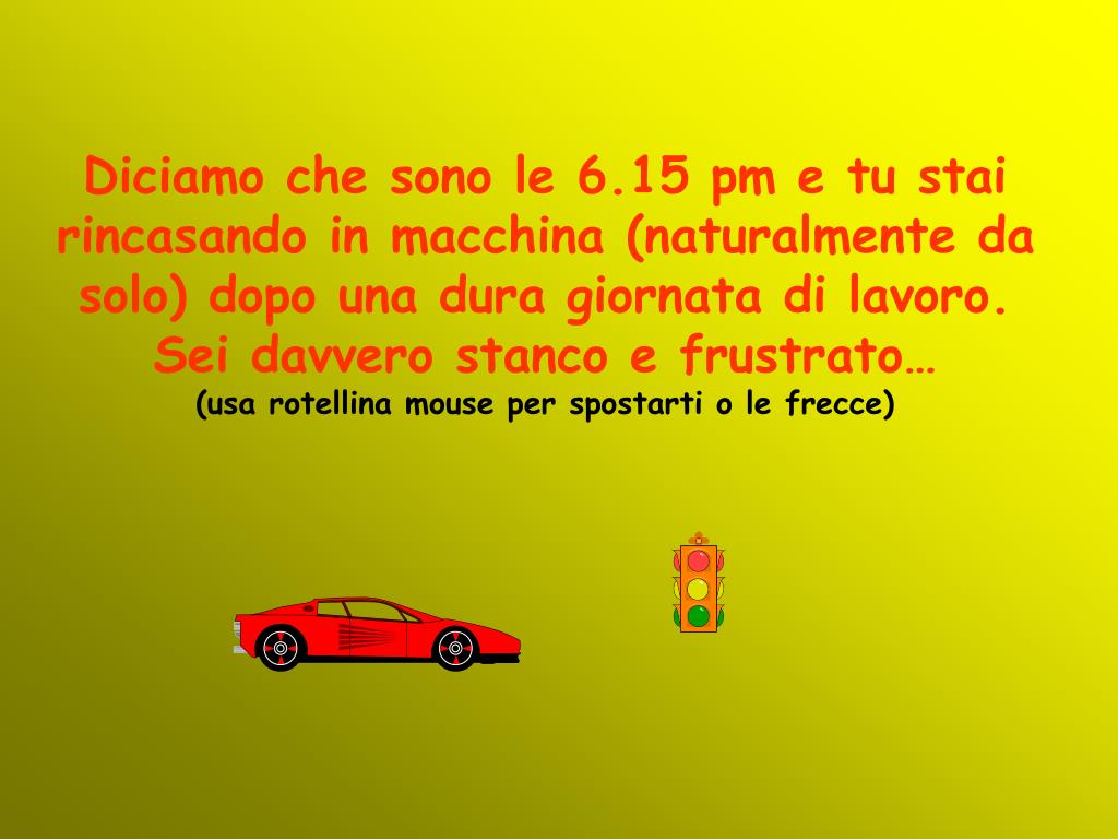 Diciamo che sono le 6.15 pm e tu stai rincasando in macchina (naturalmente da solo) dopo una dura giornata di lavoro. Sei davvero stanco e frustrato… (usa rotellina mouse per spostarti o le frecce)