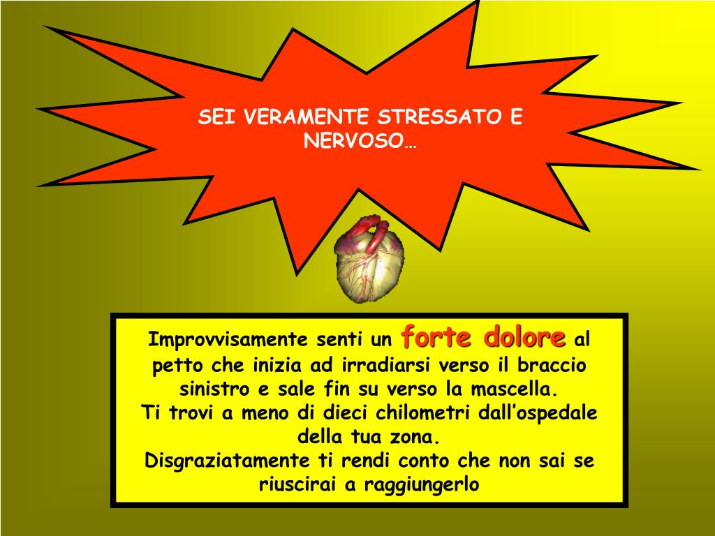 SEI VERAMENTE STRESSATO E NERVOSO… Improvvisamente senti un forte dolore al petto che inizia ad irradiarsi verso il braccio sinistro e sale fin su verso la mascella. Ti trovi a meno di dieci chilometri dall’ospedale della tua zona. Disgraziatamente ti rendi conto che non sai se riuscirai a raggiungerlo