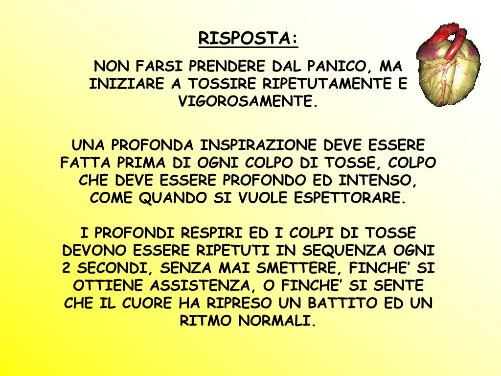 RISPOSTA: NON FARSI PRENDERE DAL PANICO, MA INIZIARE A TOSSIRE RIPETUTAMENTE E VIGOROSAMENTE. UNA PROFONDA INSPIRAZIONE DEVE ESSERE FATTA PRIMA DI OGNI COLPO DI TOSSE, COLPO CHE DEVE ESSERE PROFONDO ED INTENSO, COME QUANDO SI VUOLE ESPETTORARE. I PROFONDI RESPIRI ED I COLPI DI TOSSE DEVONO ESSERE RIPETUTI IN SEQUENZA OGNI 2 SECONDI, SENZA MAI SMETTERE, FINCHE’ SI OTTIENE ASSISTENZA, O FINCHE’ SI SENTE CHE IL CUORE HA RIPRESO UN BATTITO ED UN RITMO NORMALI.