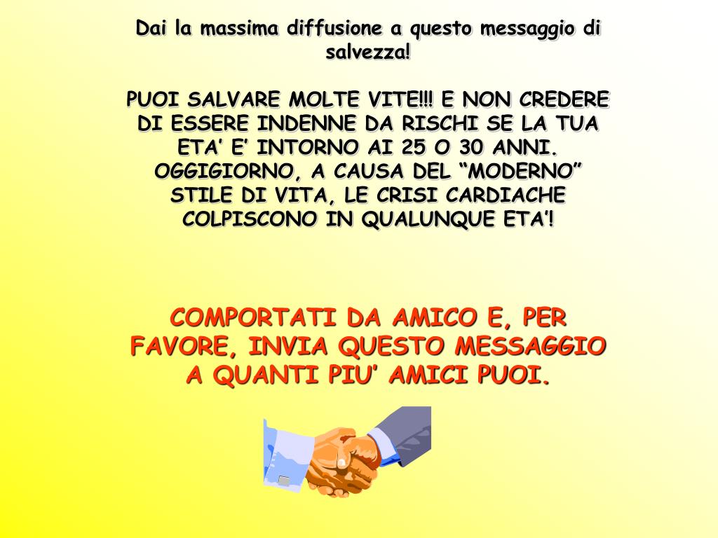 Dai la massima diffusione a questo messaggio di salvezza! PUOI SALVARE MOLTE VITE!!! E NON CREDERE DI ESSERE INDENNE DA RISCHI SE LA TUA ETA’ E’ INTORNO AI 25 O 30 ANNI. OGGIGIORNO, A CAUSA DEL “MODERNO” STILE DI VITA, LE CRISI CARDIACHE COLPISCONO IN QUALUNQUE ETA’! COMPORTATI DA AMICO E, PER FAVORE, INVIA QUESTO MESSAGGIO A QUANTI PIU’ AMICI PUOI.