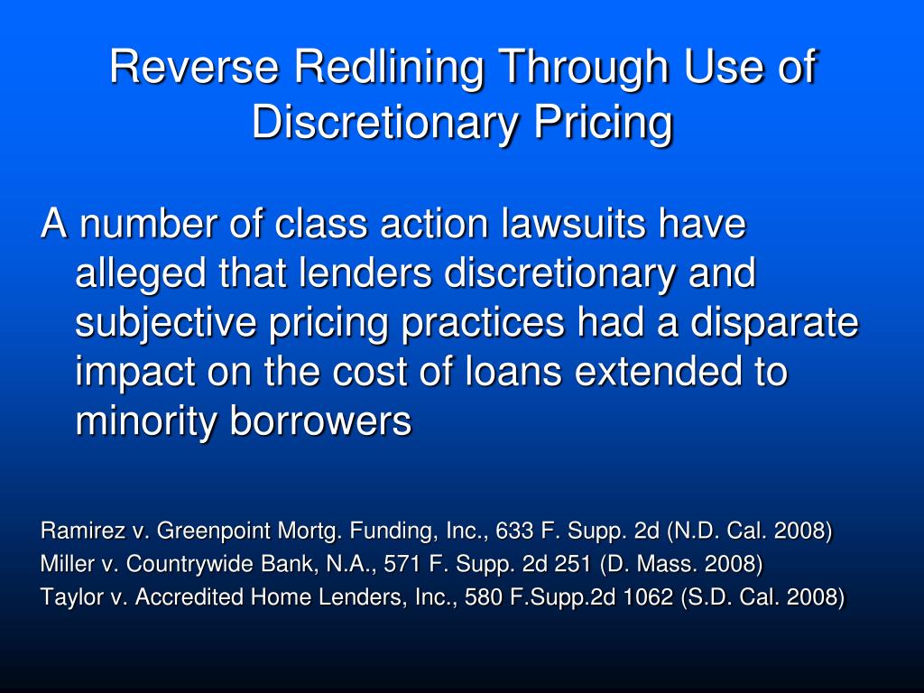 Reverse Redlining Through Use of Discretionary Pricing A number of class action lawsuits have alleged that lenders discretionary and subjective pricing practices had a disparate impact on the cost of loans extended to minority borrowers Ramirez v. GreenpointMortg. Funding, Inc., 633 F. Supp. 2d (N.D. Cal. 2008) Miller v. Countrywide Bank, N.A., 571 F. Supp. 2d 251 (D. Mass. 2008) Taylor v. Accredited Home Lenders, Inc., 580 F.Supp.2d 1062 (S.D. Cal. 2008)