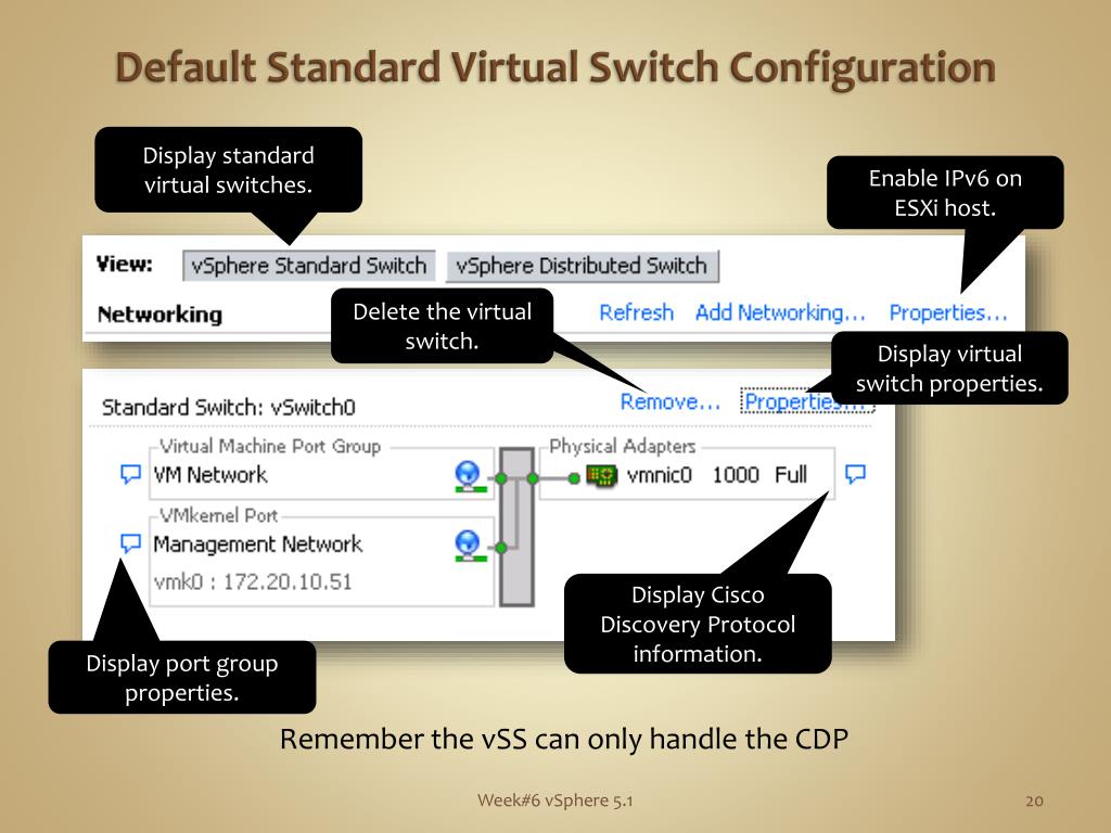 Default Standard Virtual Switch Configuration Display standard virtual switches. Enable IPv6 on ESXi host. Remember the vSS can only handle the CDP Delete the virtual switch. Display virtual switch properties. Display Cisco Discovery Protocol information. Display port group properties. Week#6 vSphere 5.1