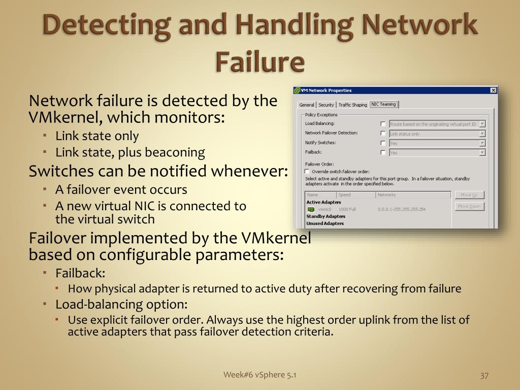 Detecting and Handling Network Failure Network failure is detected by the VMkernel, which monitors: • Link state only • Link state, plus beaconing Switches can be notified whenever: • A failover event occurs • A new virtual NIC is connected to the virtual switch Failover implemented by the VMkernel based on configurable parameters: • Failback: • How physical adapter is returned to active duty after recovering from failure • Load-balancing option: • Use explicit failover order. Always use the highest order uplink from the list of active adapters that pass failover detection criteria. Week#6 vSphere 5.1