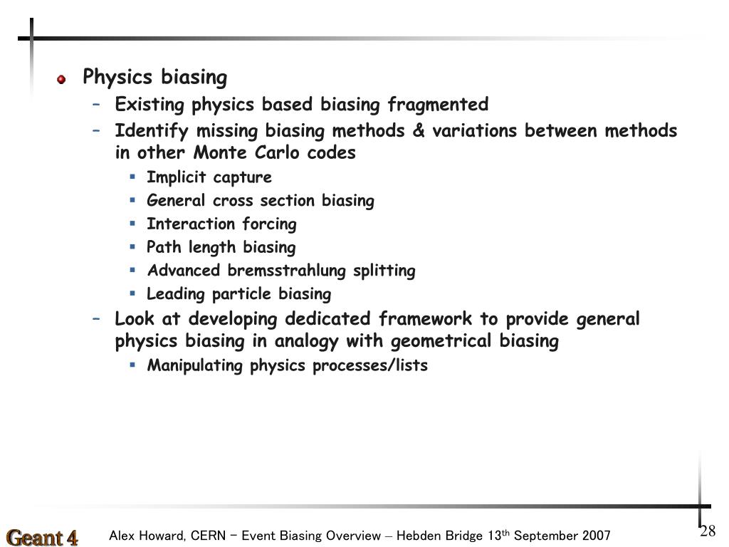 Physics biasing • Existing physics based biasing fragmented • Identify missing biasing methods & variations between methods in other Monte Carlo codes • Implicit capture • General cross section biasing • Interaction forcing • Path length biasing • Advanced bremsstrahlung splitting • Leading particle biasing • Look at developing dedicated framework to provide general physics biasing in analogy with geometrical biasing • Manipulating physics processes/lists