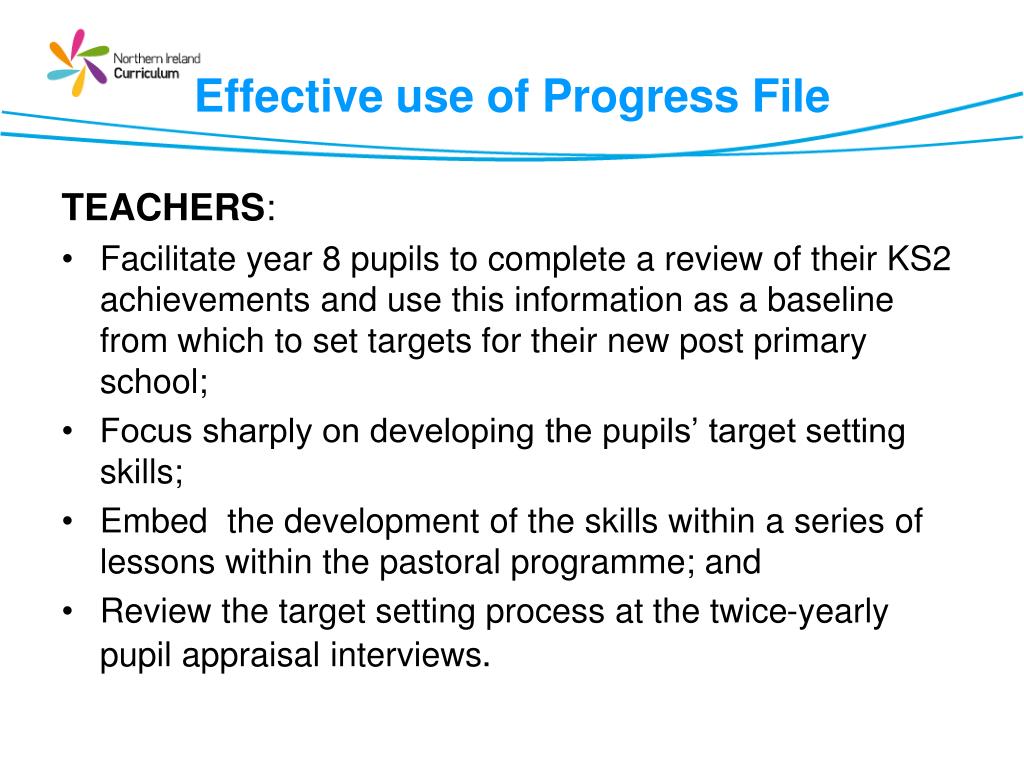 Effective use of Progress File TEACHERS: • Facilitate year 8 pupils to complete a review of their KS2 achievements and use this information as a baseline from which to set targets for their new post primary school; • Focus sharply on developing the pupils’ target setting skills; • Embed the development of the skills within a series of lessons within the pastoral programme; and • Review the target setting process at the twice-yearly pupil appraisal interviews.