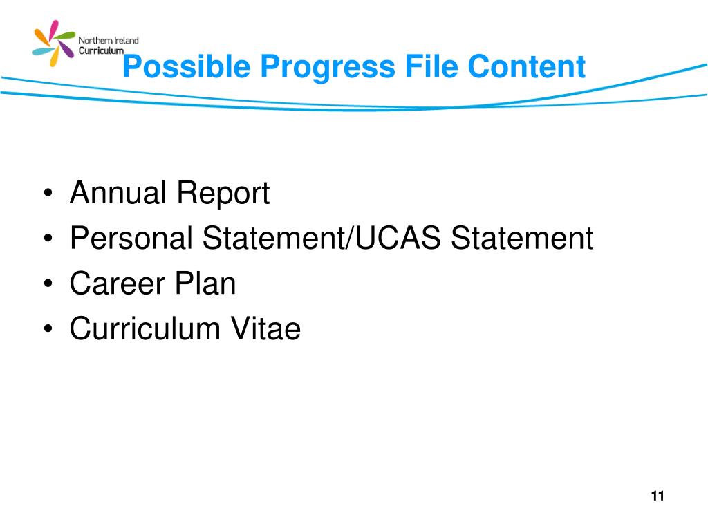 Possible Progress File Content • Annual Report • Personal Statement/UCAS Statement • Career Plan • Curriculum Vitae
