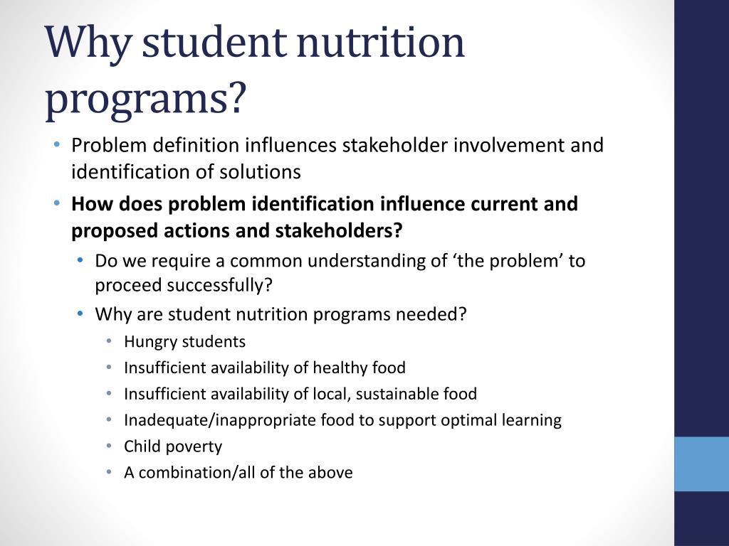 Why student nutrition programs? • Problem definition influences stakeholder involvement and identification of solutions • How does problem identification influence current and proposed actions and stakeholders? • Do we require a common understanding of ‘the problem’ to proceed successfully? • Why are student nutrition programs needed? • Hungry students • Insufficient availability of healthy food • Insufficient availability of local, sustainable food • Inadequate/inappropriate food to support optimal learning • Child poverty • A combination/all of the above