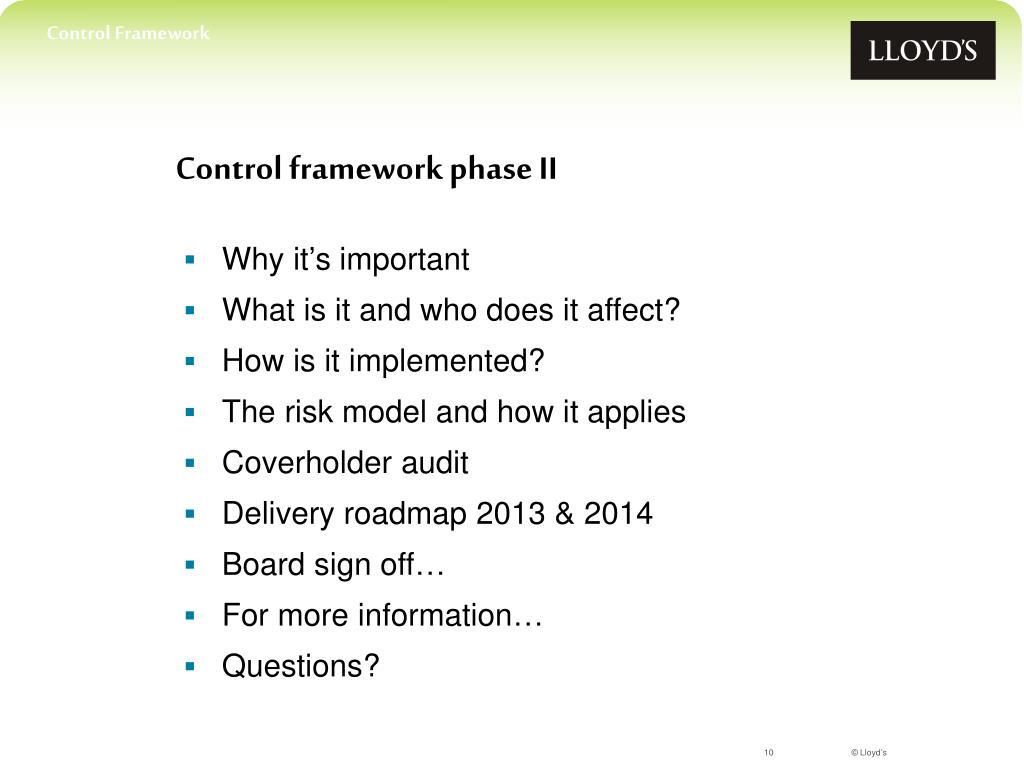 Control Framework Control framework phase II • Why it’s important • What is it and who does it affect? • How is it implemented? • The risk model and how it applies • Coverholder audit • Delivery roadmap 2013 & 2014 • Board sign off… • For more information… • Questions?