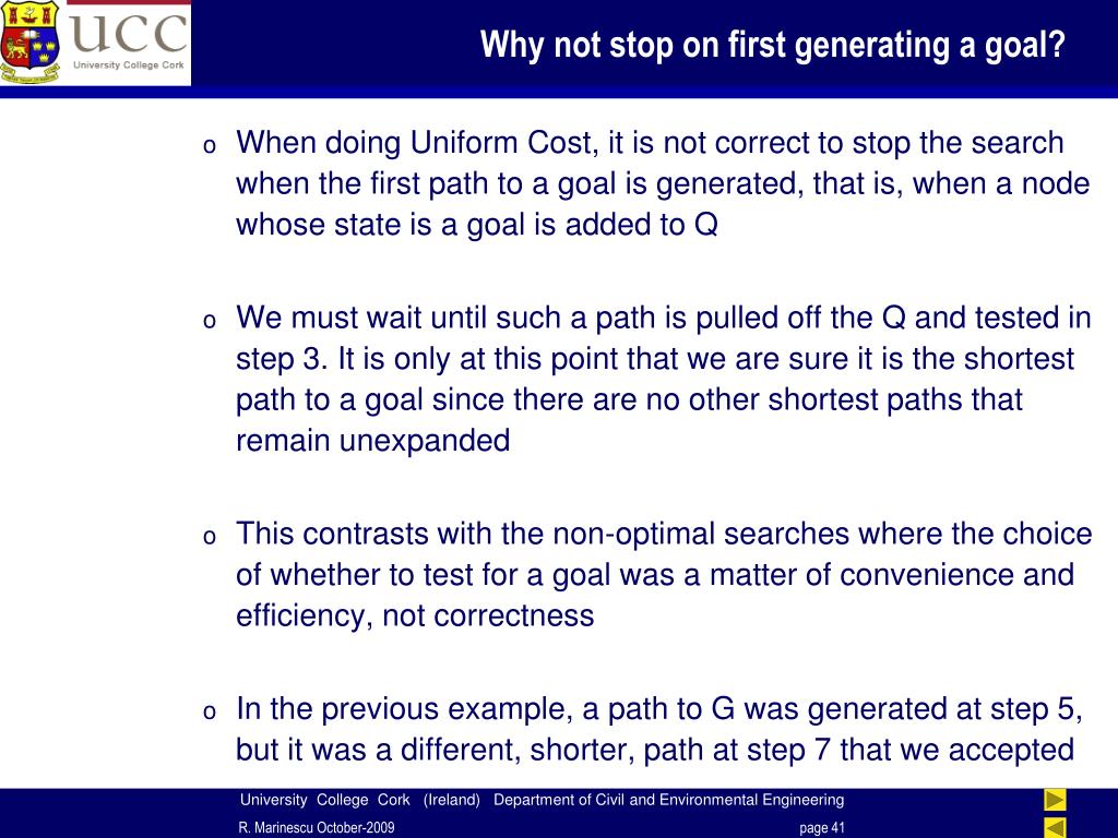 Why not stop on first generating a goal? • When doing Uniform Cost, it is not correct to stop the search when the first path to a goal is generated, that is, when a node whose state is a goal is added to Q • We must wait until such a path is pulled off the Q and tested in step 3. It is only at this point that we are sure it is the shortest path to a goal since there are no other shortest paths that remain unexpanded • This contrasts with the non-optimal searches where the choice of whether to test for a goal was a matter of convenience and efficiency, not correctness • In the previous example, a path to G was generated at step 5, but it was a different, shorter, path at step 7 that we accepted