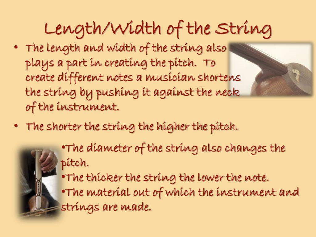 Length/Width of the String • The length and width of the string also plays a part in creating the pitch. To create different notes a musician shortens the string by pushing it against the neck of the instrument. • The shorter the string the higher the pitch. • The diameter of the string also changes the pitch. • The thicker the string the lower the note. • The material out of which the instrument and strings are made.