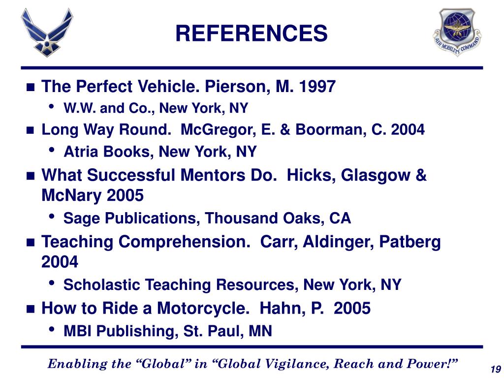 REFERENCES • The Perfect Vehicle. Pierson, M. 1997 • W.W. and Co., New York, NY • Long Way Round. McGregor, E. & Boorman, C. 2004 • Atria Books, New York, NY • What Successful Mentors Do. Hicks, Glasgow & McNary 2005 • Sage Publications, Thousand Oaks, CA • Teaching Comprehension. Carr, Aldinger, Patberg 2004 • Scholastic Teaching Resources, New York, NY • How to Ride a Motorcycle. Hahn, P. 2005 • MBI Publishing, St. Paul, MN