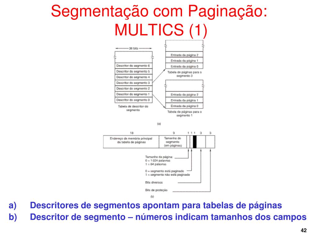 Segmentação com Paginação: MULTICS (1) • Descritores de segmentos apontam para tabelas de páginas • Descritor de segmento – números indicam tamanhos dos campos