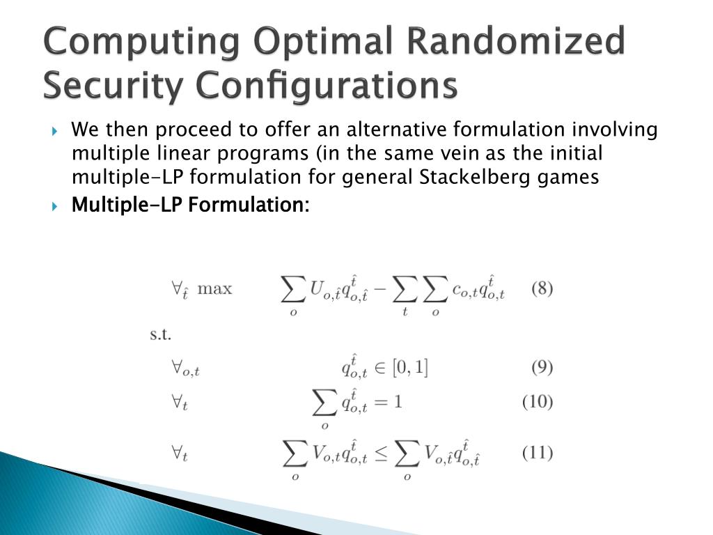 Computing Optimal Randomized Security Configurations • We then proceed to offer an alternative formulation involving multiple linear programs (in the same vein asthe initial multiple-LP formulation for general Stackelberggames • Multiple-LP Formulation: