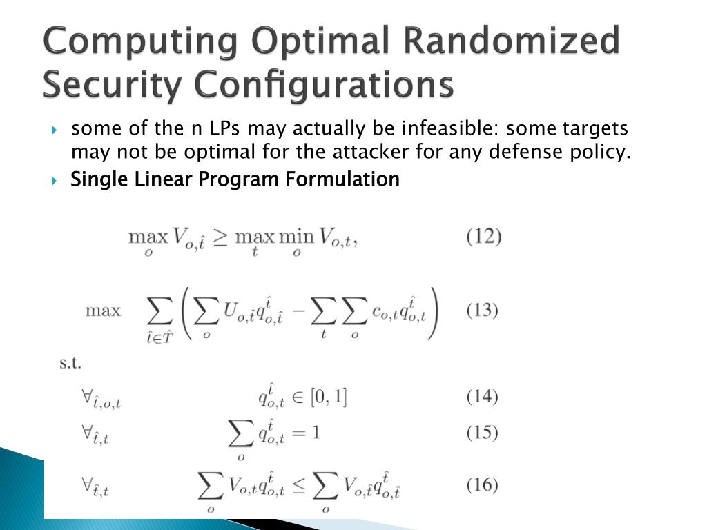Computing Optimal Randomized Security Configurations • some of the n LPs may actually be infeasible: some targetsmay not be optimal for the attacker for any defense policy. • Single Linear Program Formulation