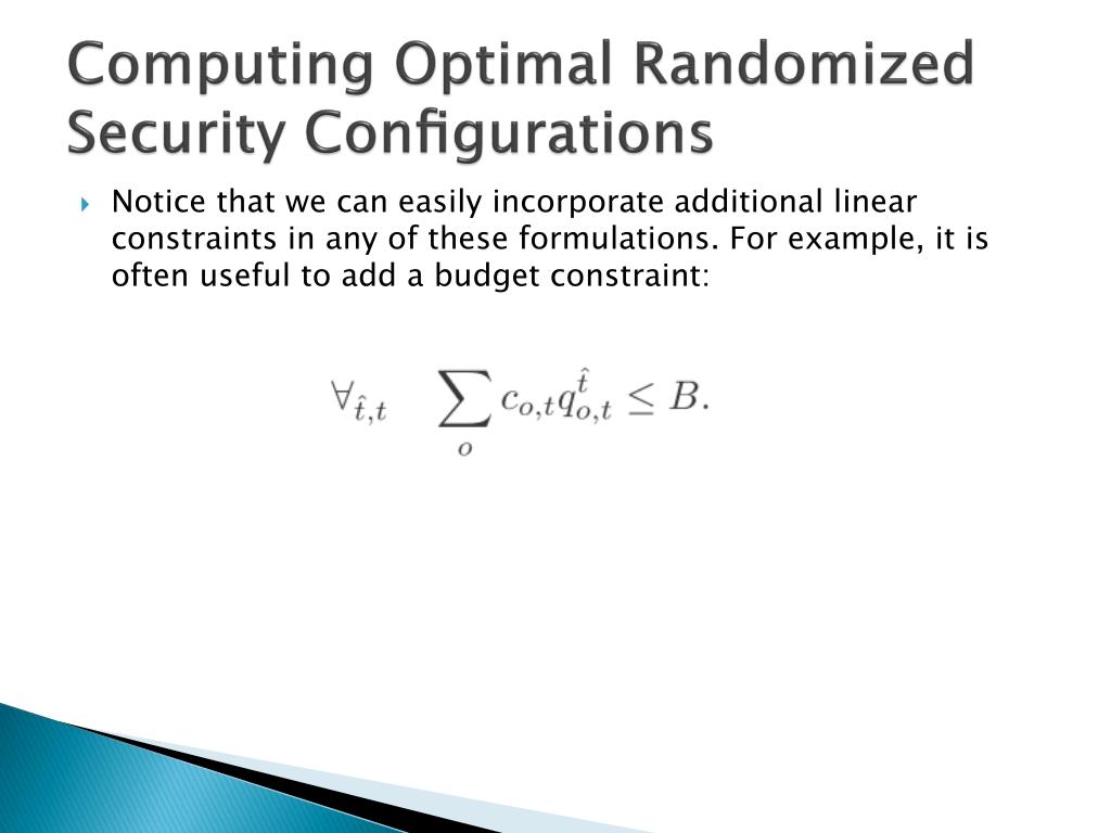 Computing Optimal Randomized Security Configurations • Notice that we can easily incorporate additional linear constraints in any of these formulations. For example, it is often useful to add a budget constraint: