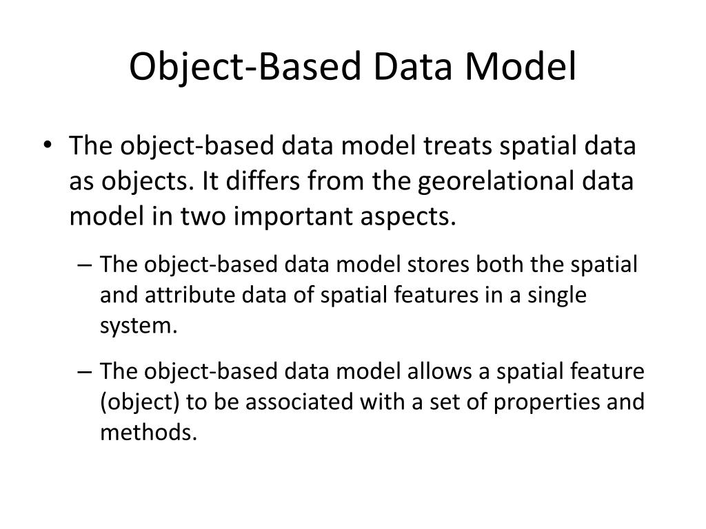 Object-Based Data Model • The object-based data modeltreats spatial data as objects. It differs from the georelational data model in two important aspects. • The object-based data model stores both the spatial and attribute data of spatial features in a single system. • The object-based data model allows a spatial feature (object) to be associated with a set of properties and methods.