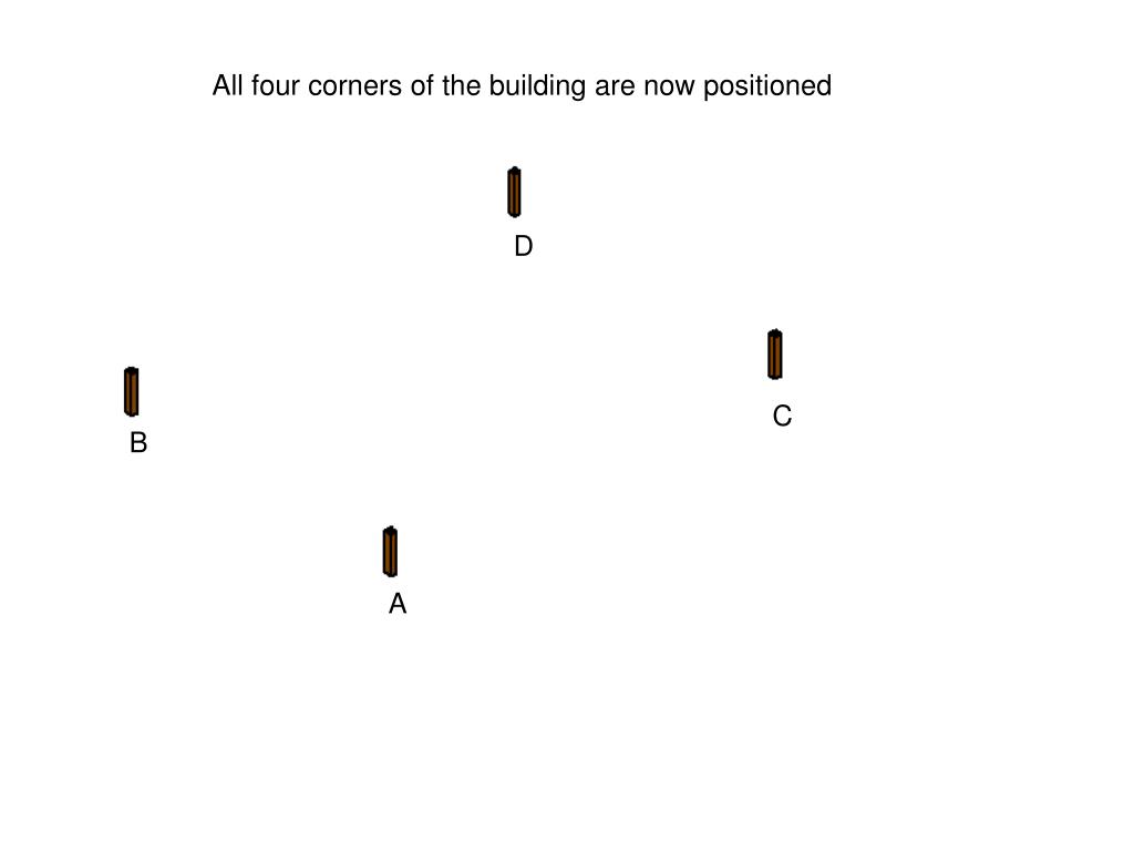 Identifying the position of the final corner D C B Check the dimensions of the side of the building ( A-C). Transfer the measurement to the other side to (B-D) Drive in a temporary peg. A