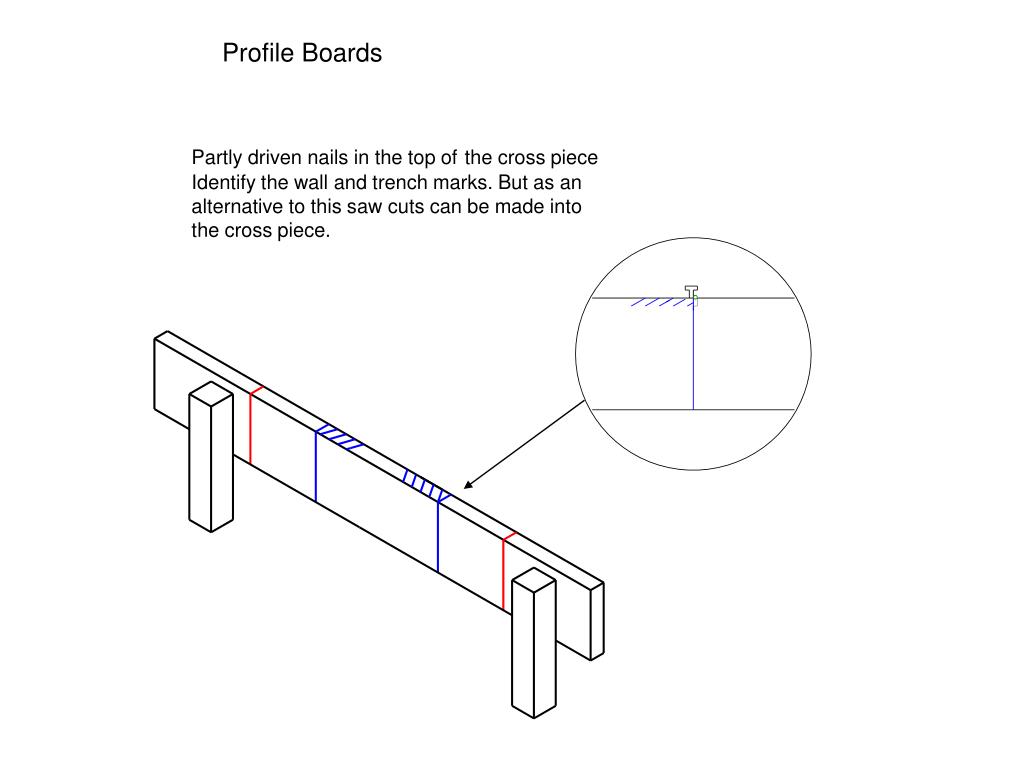 Profile Boards Partly driven nails in the top ofthe cross piece Identify the wall and trench marks. But as an alternative to this saw cuts can be made into the cross piece.