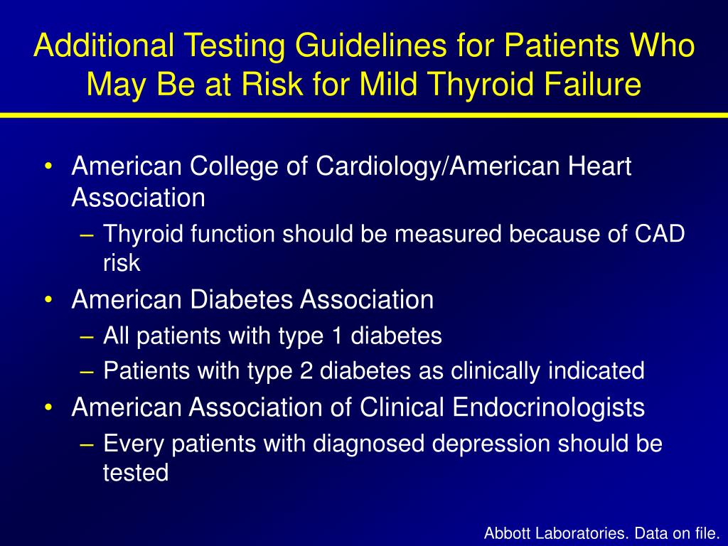 Additional Testing Guidelines for Patients Who May Be at Risk for Mild Thyroid Failure • American College of Cardiology/American Heart Association • Thyroid function should be measured because of CAD risk • American Diabetes Association • All patients with type 1 diabetes • Patients with type 2 diabetes as clinically indicated • American Association of Clinical Endocrinologists • Every patients with diagnosed depression should be tested Abbott Laboratories. Data on file.