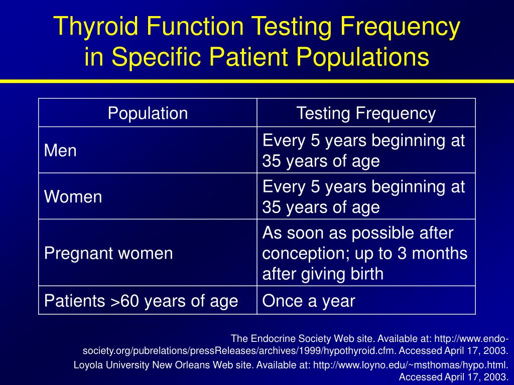 Thyroid Function Testing Frequency in Specific Patient Populations The Endocrine Society Web site. Available at: http://www.endo-society.org/pubrelations/pressReleases/archives/1999/hypothyroid.cfm. Accessed April 17, 2003. Loyola University New Orleans Web site. Available at: http://www.loyno.edu/~msthomas/hypo.html. Accessed April 17, 2003.