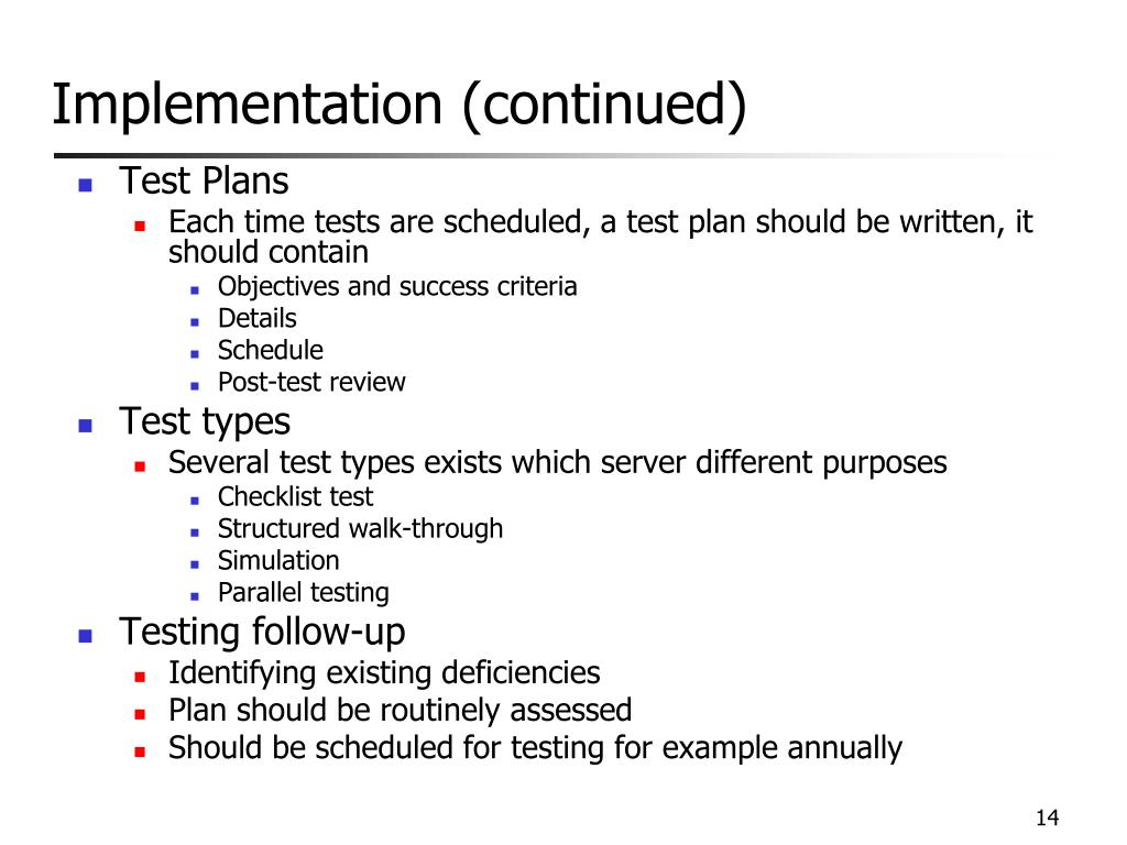 Implementation (continued) • Test Plans • Each time tests are scheduled, a test plan should be written, it should contain • Objectives and success criteria • Details • Schedule • Post-test review • Test types • Several test types exists which server different purposes • Checklist test • Structured walk-through • Simulation • Parallel testing • Testing follow-up • Identifying existing deficiencies • Plan should be routinely assessed • Should be scheduled for testing for example annually 14